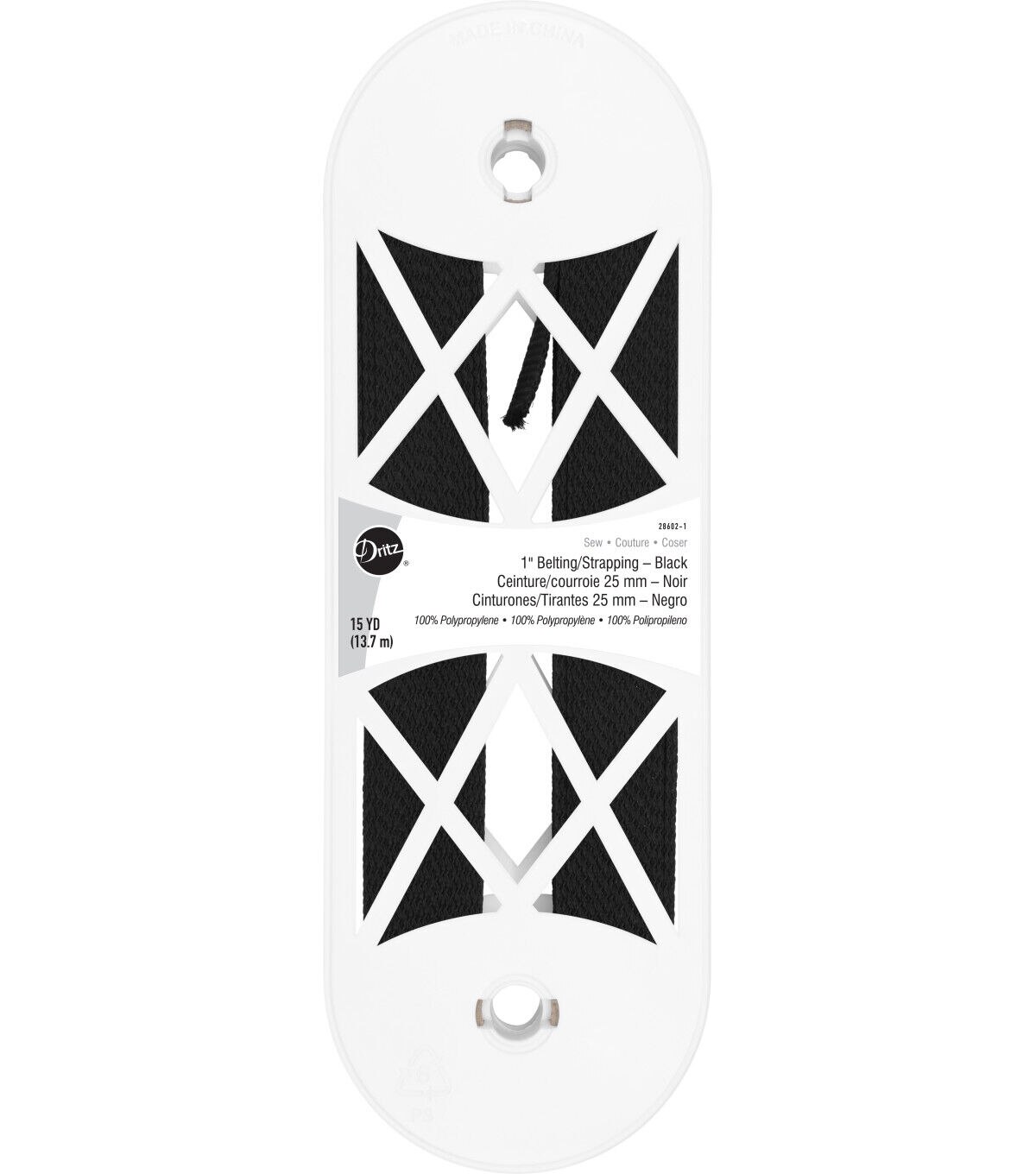 The Dritz Polypropylene Belting - Black will be a useful addition to your sewing supplies. This reel includes 15 yards of 1-inch-wide elastic belting that sports a black shade. This item is sold by the yard. It is made from polypropylene. You can use it to add belting to your luggage, sporting equipment and tote bags.