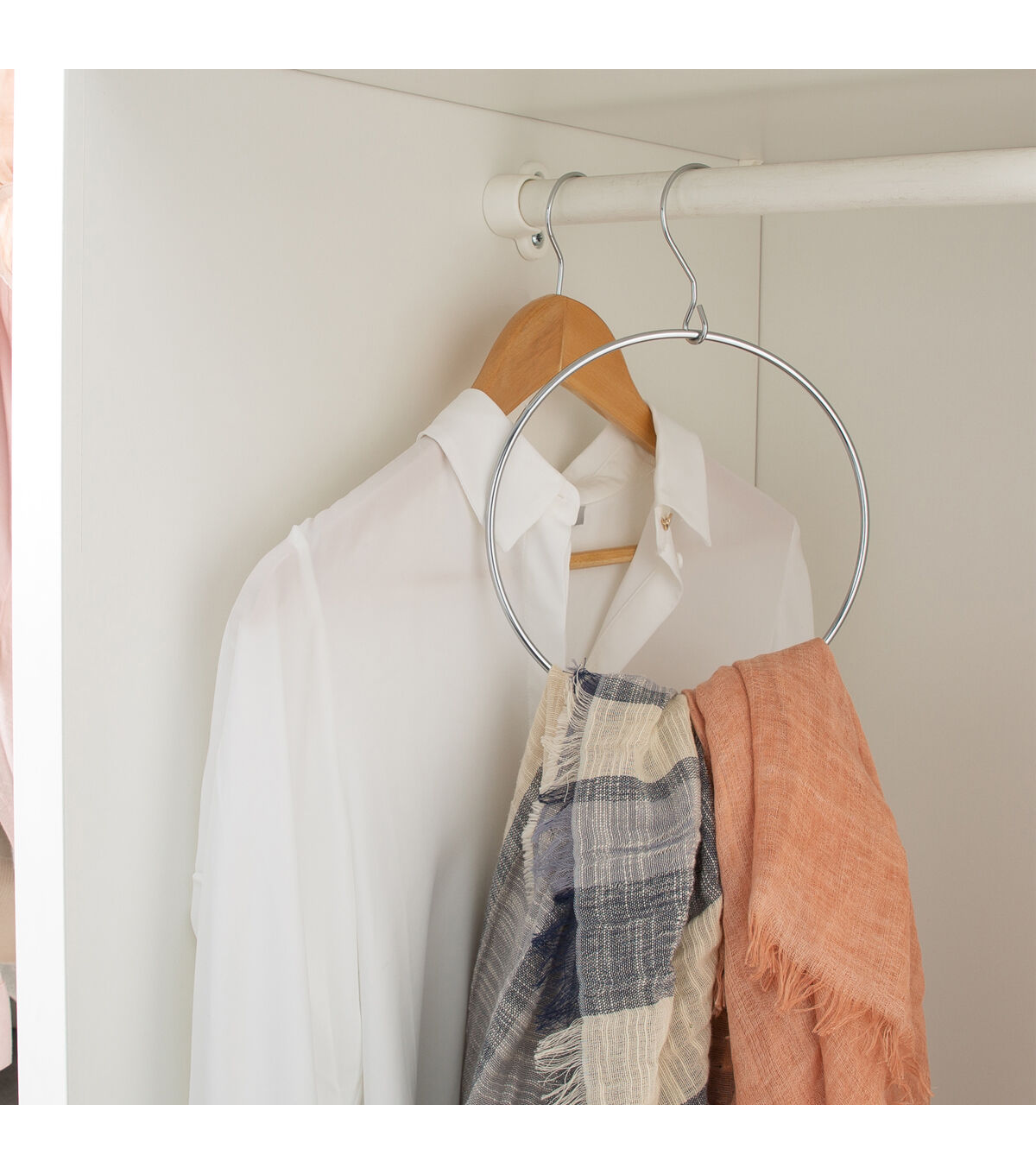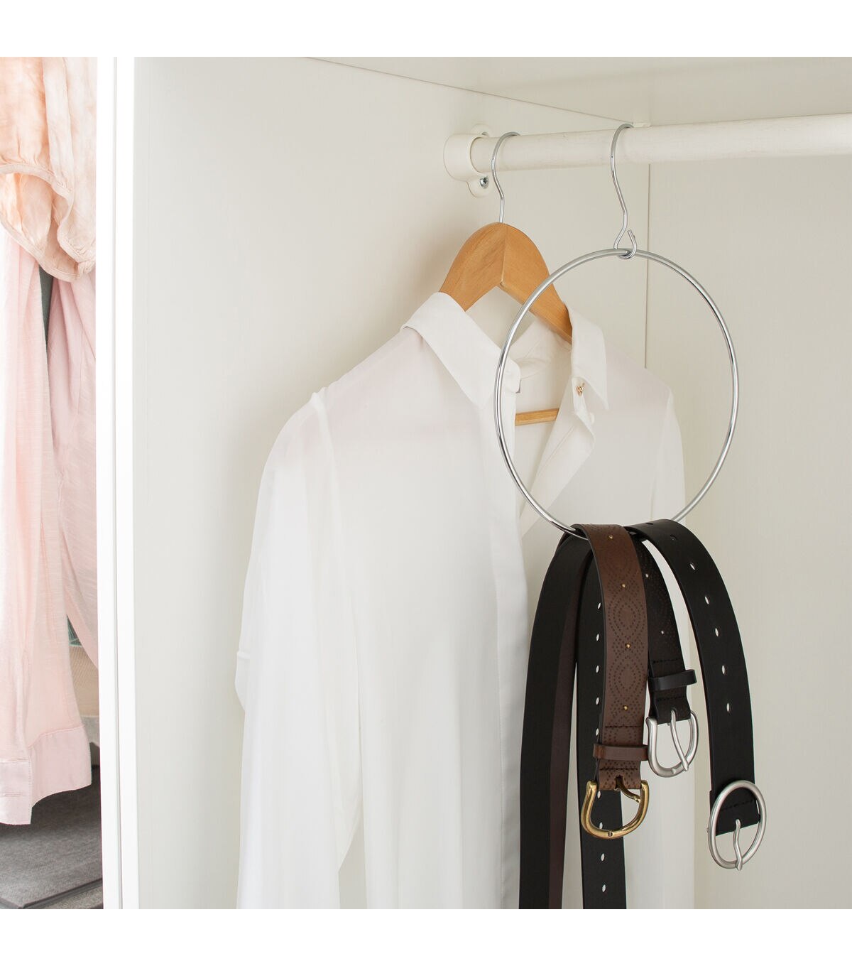 Conveniently hang your belts and scarves with the Organize It All Belt/Scarf Ring. The ring hangs in any closet to organize your items. The loop separates and spins freely to allow for easy addition and removal of a single belt. They help make your closet look clean and organized. You can also use them in the bathroom or kitchen to hang hand towels.