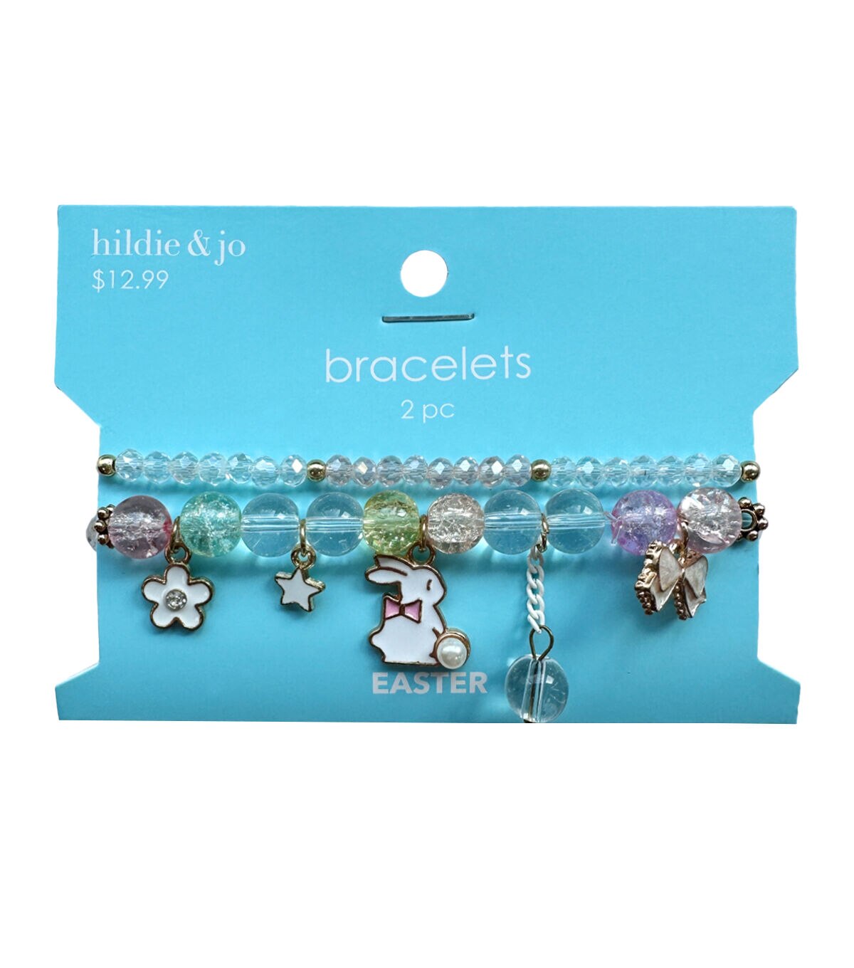 Add a finishing touch to your Easter party look with the Easter Bunny Charm Stack Bracelets by hildie & jo. This pack includes two bracelets one designed with clear rondelle beads and silver beads. The other is crafted with colorful round beads and charms shaped like a bunny, star, flower or bow. They will also make a delightful gift for a friend.