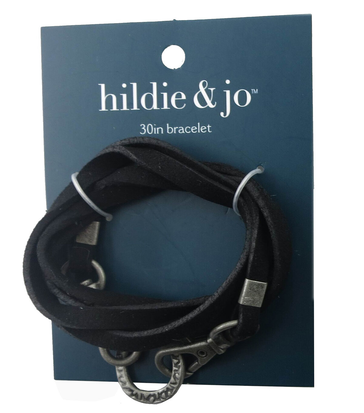 Carry your charms and slender pendants elegantly by stringing them on the hildie & jo Black Bracelet with Antique Silver Hardware. It's made of a leather-like fabric and wraps around the wrist with ease. The bracelet is further adorned with antique silver hardware and has a lobster clasp for easy attachment. This pack contains one wrap bracelet made of iron, cording and alloy.
