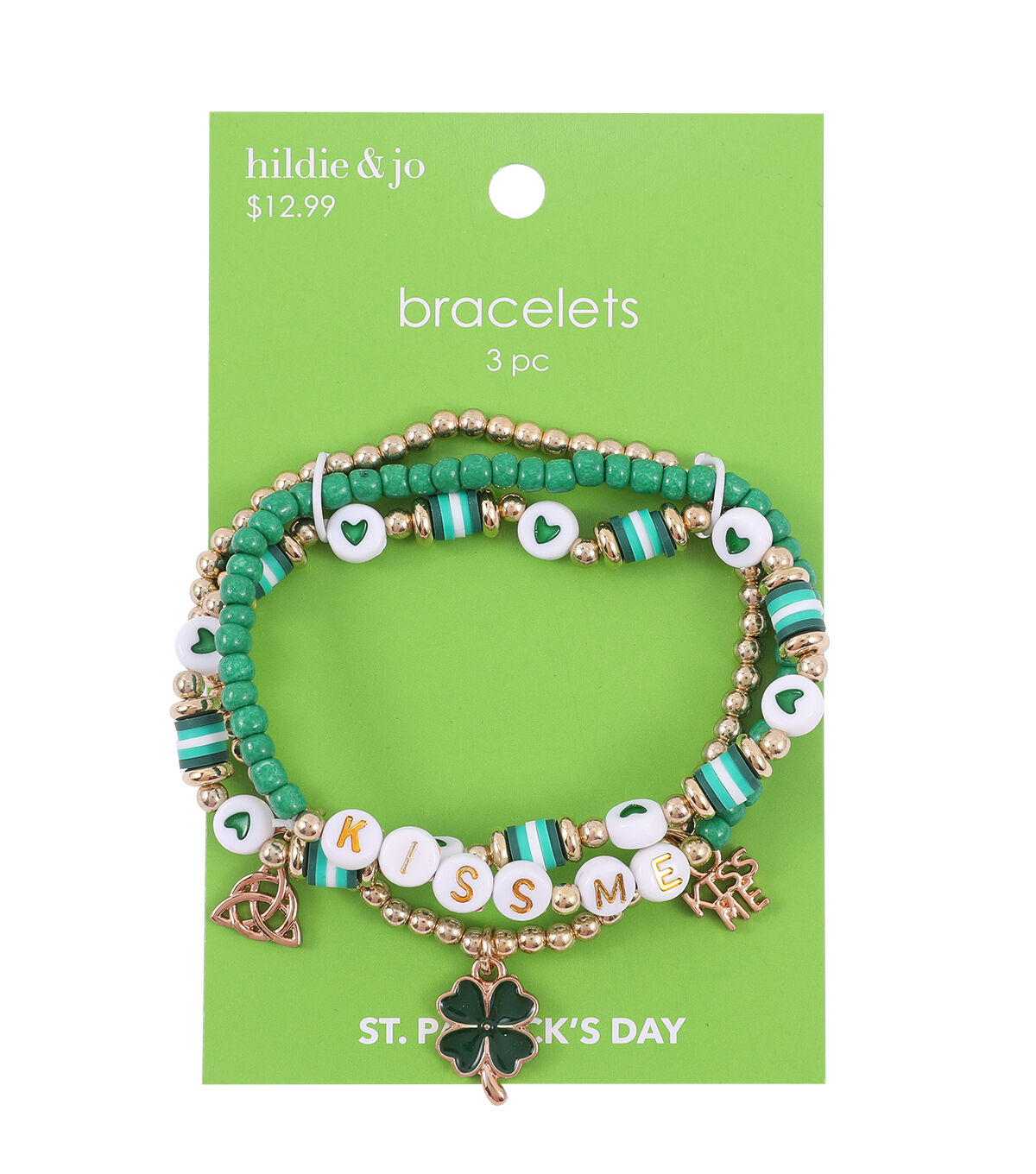 Jazz up your look for St. Patrick’s Day with the St. Patrick's Day Clover & Knot Beaded Bracelets by hildie & jo. This pack includes three bracelets, each uniquely designed with beads flaunting gold, green and white tones. Beautiful charms shaped like the Celtic knot and clover leaves give them the complete look. One of them is crafted with letter beads forming the words ‘Kiss Me.’ You can also gift them to a friend.
