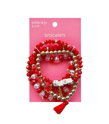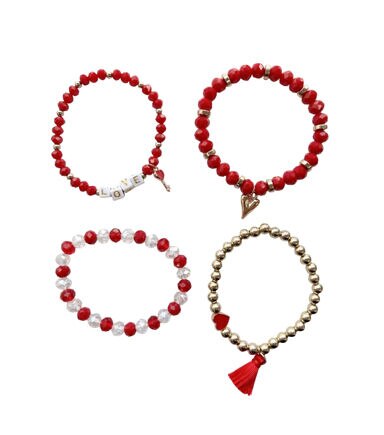 Glamorize your Valentine’s Day dinner look with the Valentine's Day Stretch Love Bracelets by hildie & jo. This pack comes with four stretch bracelets made of red, gold-toned and clear beads. Some of them are designed with alphabet beads that spell ‘Love’ and charms shaped like a key, heart and tassel. You can wear a single piece from this set or all four together for a unique look.