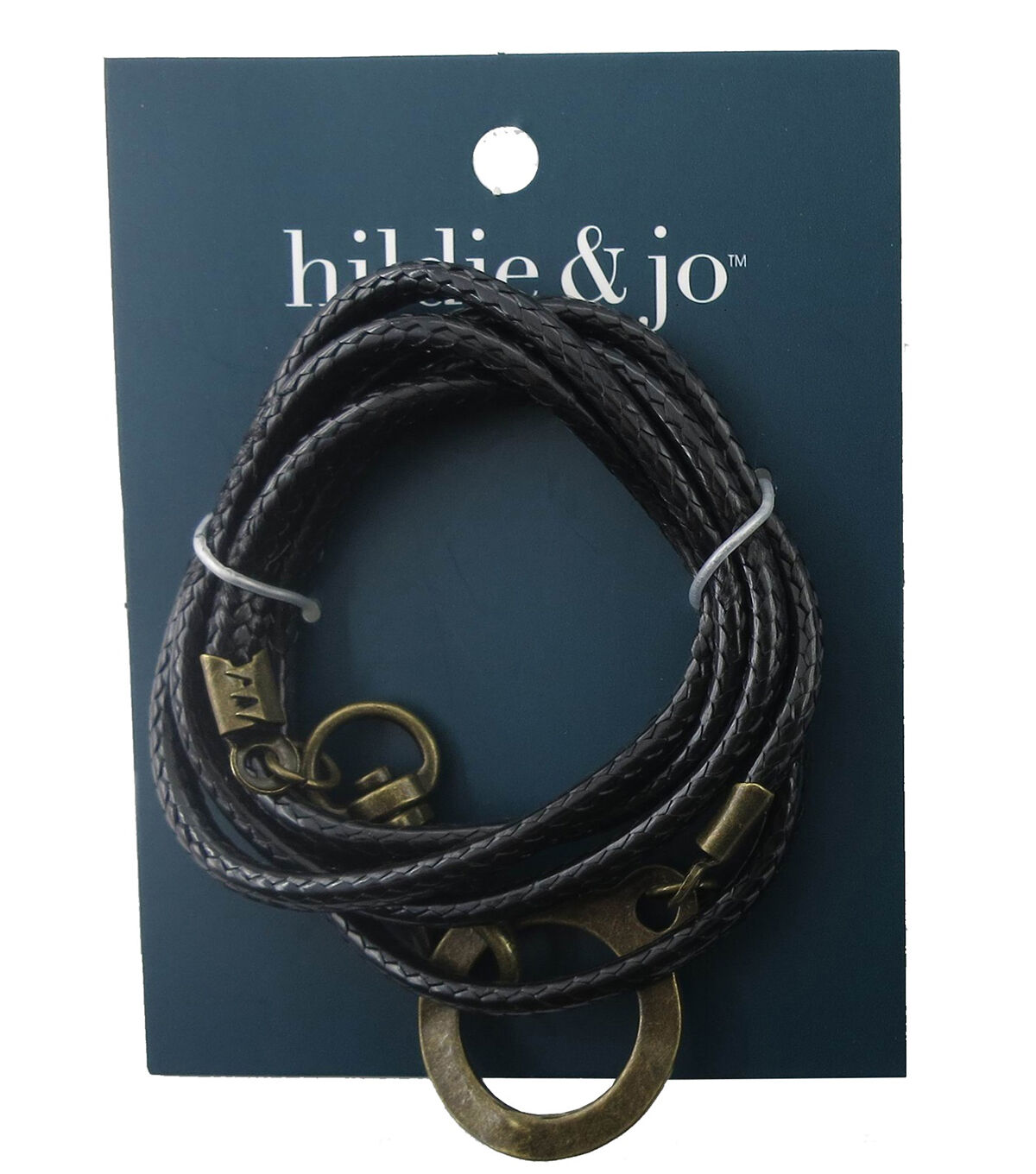 Flaunt the hildie & jo Wrap Bracelet-Black to accessorize your stylish look. This braided bracelet is designed using a black leather-like fabric, and accented with antique gold end caps and findings. It’s got a lobster clasp for easy attachment. You can add more charms, if desired, for enhanced visual appeal.