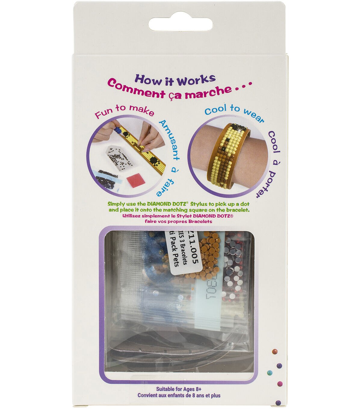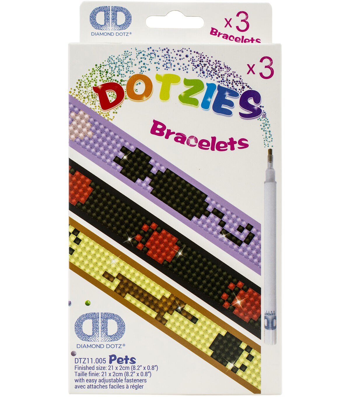 Diamond Dotz is a phenomenal new craft that is quick, easy and fun to do. Your design is created with ''Diamond'' like facets that shimmer in the light. Using the Diamond Dotz stylus, simply pick up a facet and place it onto the sticky design surface. Nothing can prepare you for the spectacular sparkling result of your finished project! This package contains three bracelets, .3oz of pre-sorted Diamond Dotz, one stylus, one craft tray, wax and instructions. Finished size: 8.2x.8 inches. Imported.