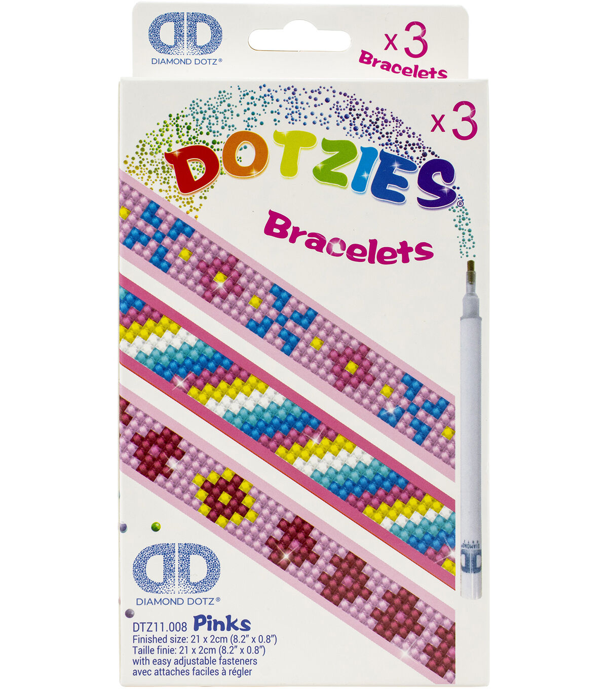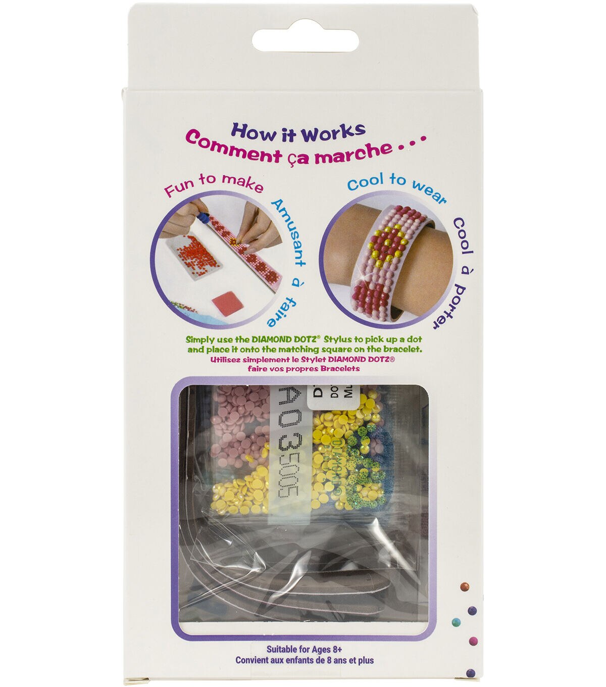 Diamond Dotz is a phenomenal new craft that is quick, easy and fun to do. Your design is created with ''Diamond'' like facets that shimmer in the light. Using the Diamond Dotz stylus, simply pick up a facet and place it onto the sticky design surface. Nothing can prepare you for the spectacular sparkling result of your finished project! This package contains three bracelets, .3oz of pre-sorted Diamond Dotz, one stylus, one craft tray, wax and instructions. Finished size: 8.2x.8 inches. Imported.