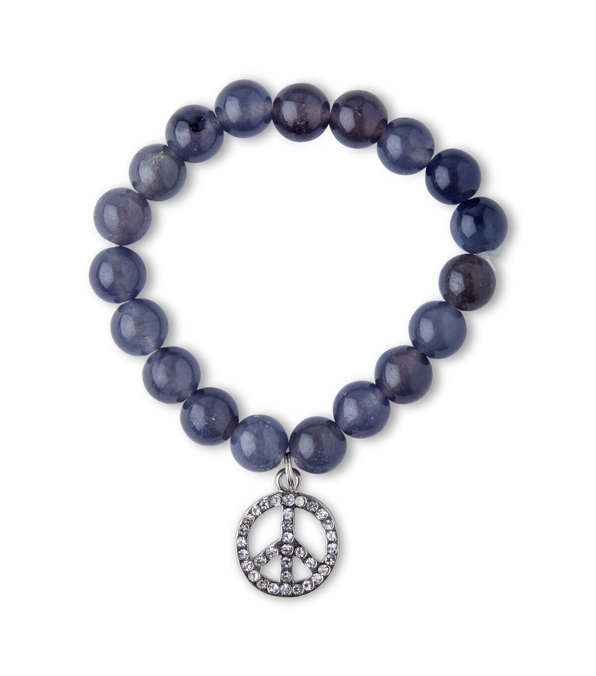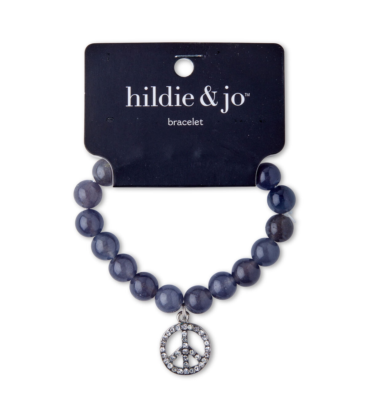 Infuse a fresh and lovely look into your jewelry-making projects using the hildie & jo Beads Stretch Bracelet-Gray with Silver Peace Charm. The bracelet features round stone beads in gray and has a peace sign accent charm with round clear crystals in silver for visual flair. You can accessorize it with fancy charms to complement an outfit.