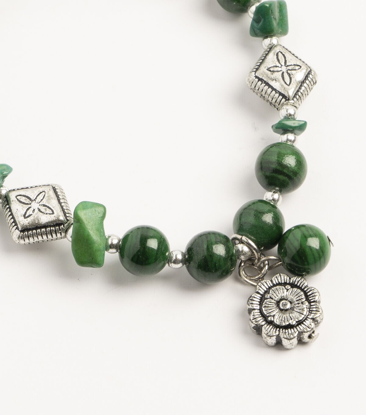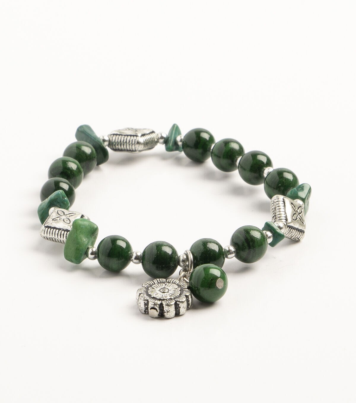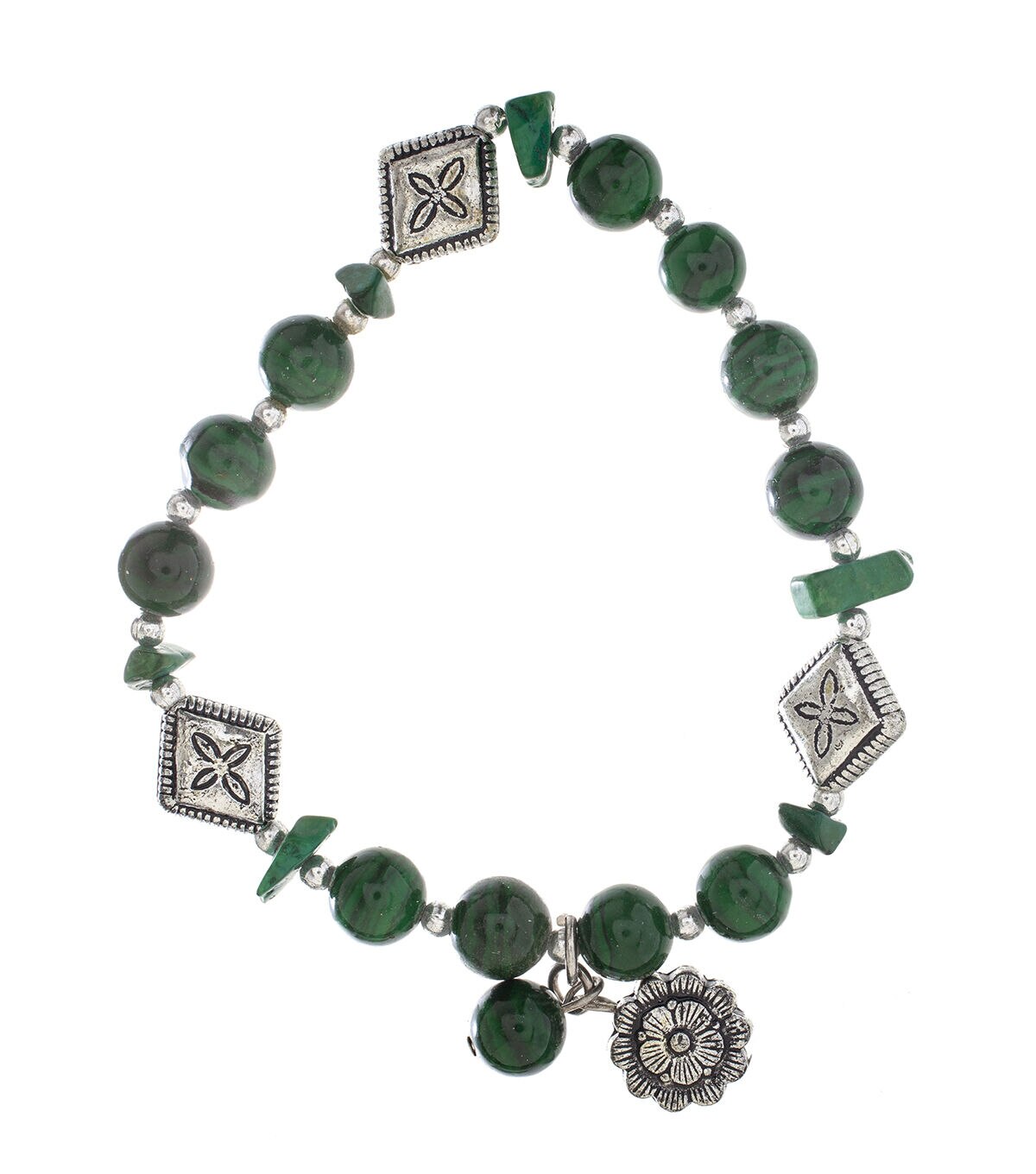 Semi-Precious Stretch Bracelet (Natural Jasper) Dyed Round Malachite with Flower Charm and Metal Beads make a great accessory for any occasion, from casual outings to formal events, and can be paired with other jewelry pieces to create a stylish and sophisticated look.
