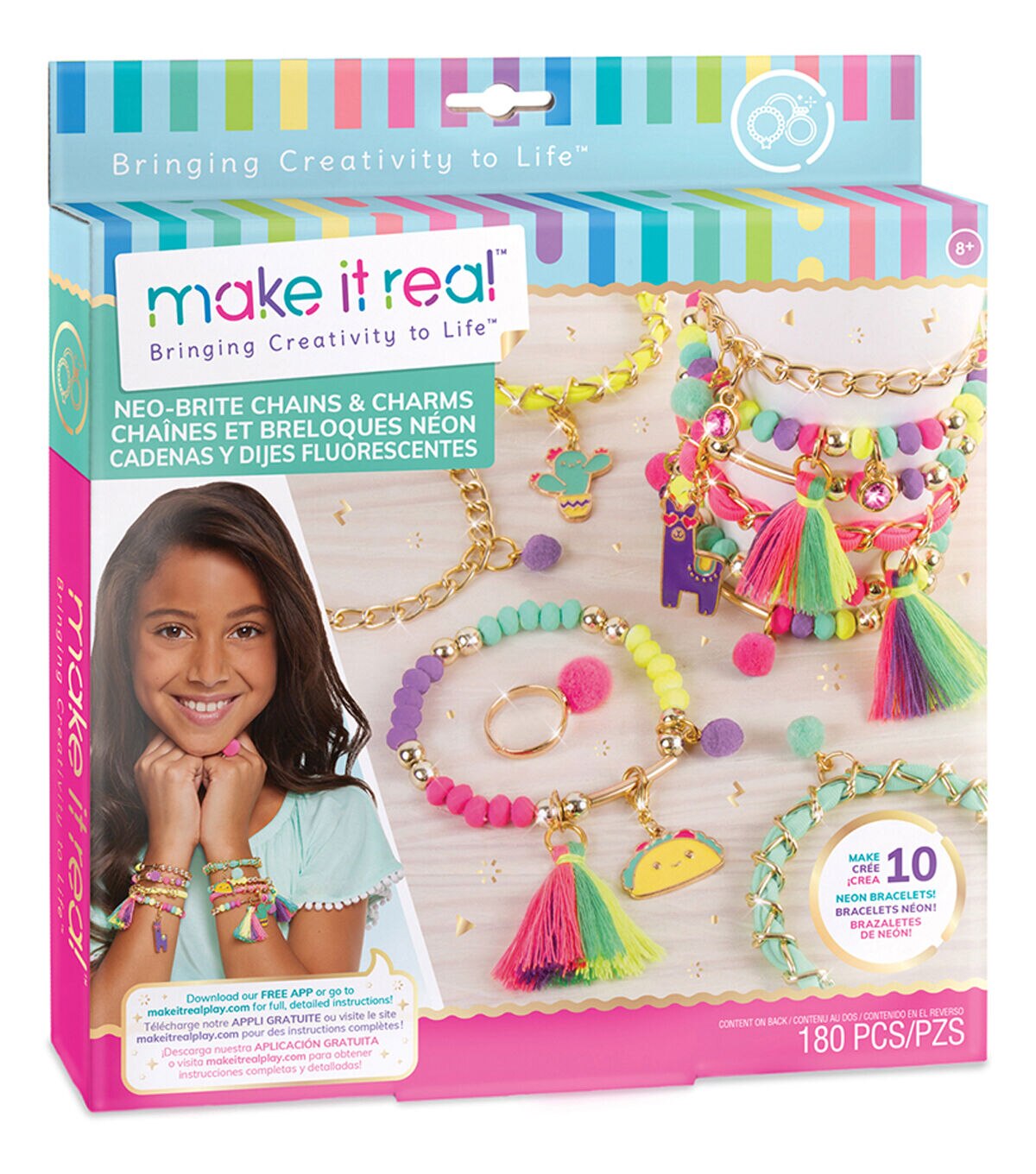 - This bracelet kit has everything your child needs to create up to TEN eye-catching charm bracelets. Includes beads, gold chains, tassle charms, pompom charms, gem charms, and much more!
