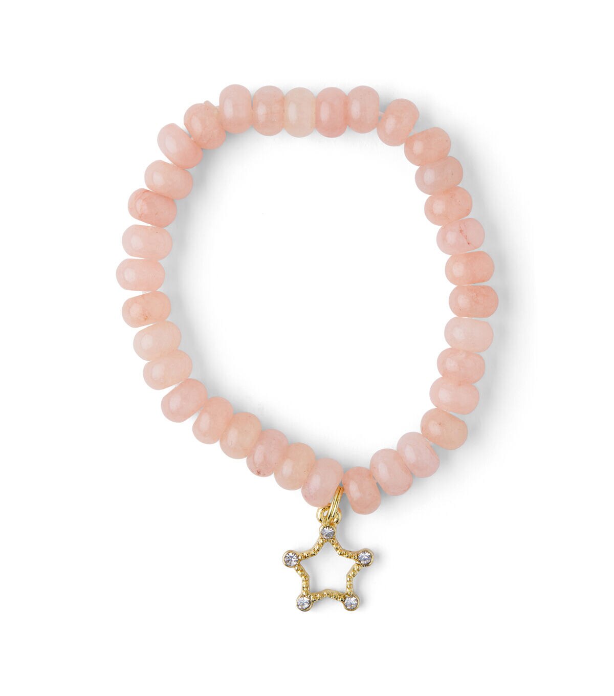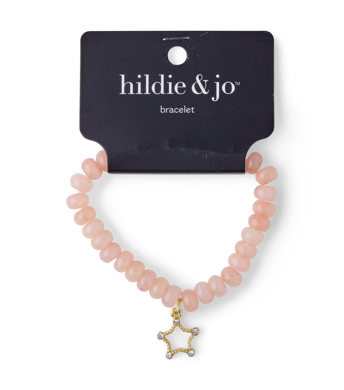 Infuse a fresh and lovely look into your jewelry-making projects using the hildie & jo Beads Stretch Bracelet-Pink with Gold Star Charm. It features oval stone beads a light pink color. The bracelet has an open star charm in gold with clear round crystals at each point for visual flair. You can accessorize it with fancy charms to complement an outfit.