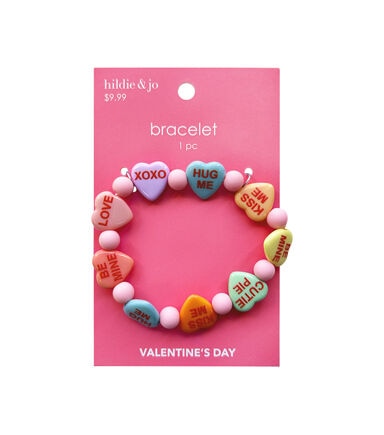 Accessorize your Valentine’s Day party attire with the Valentine's Day Candy Heart Stretch Bracelet by hildie & jo. This adorable bracelet is designed with heart-shaped accents and beads in beautiful hues. Words like ‘Love,’ ‘Hug Me,’ Be Mine,’ ‘XOXO’ and more are printed on the hearts. It will complement outfits in any color. Team it with a pair of heart-shaped earrings, sold separately, for the perfect look.