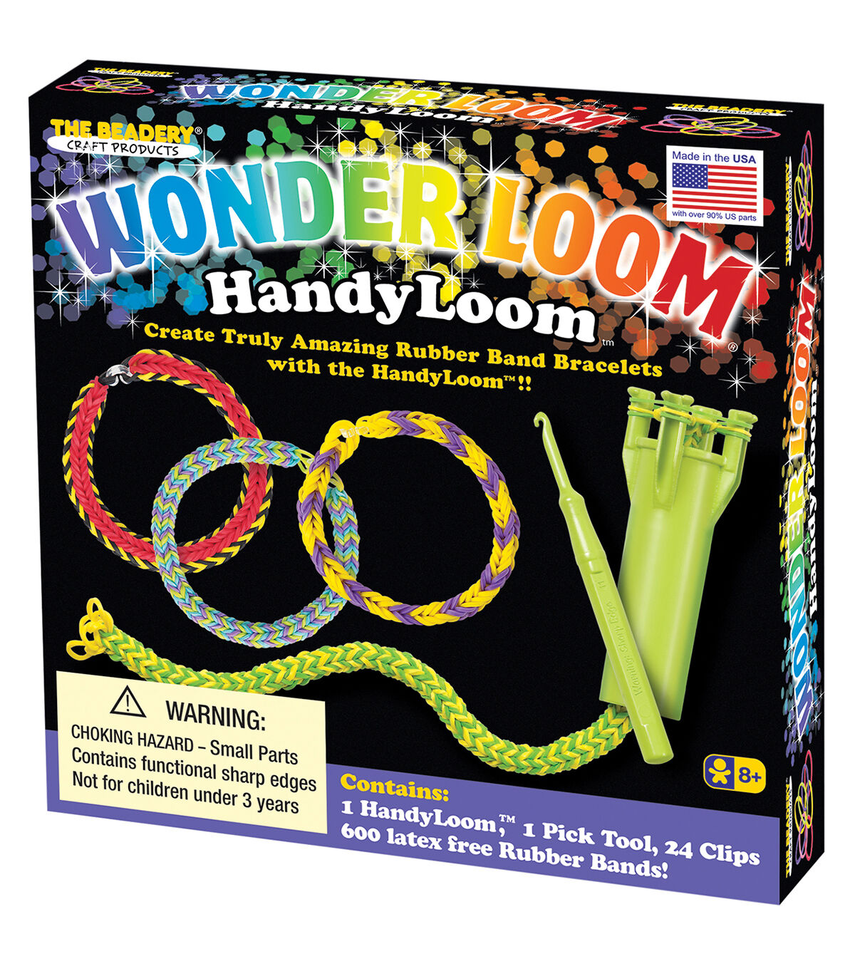 Beadery-Handytool Kit. Create truly amazing rubber band bracelets with the handy loom tool! It is fun and easy! This 6-1/2x6-1/4 inch package contains one handy loom, one pick tool, twenty-four clips and 600 latex free rubber bands. Recommended for ages 8 and up. WARNING: Choking Hazard-small parts. Not for children under 3 years. Made in USA.