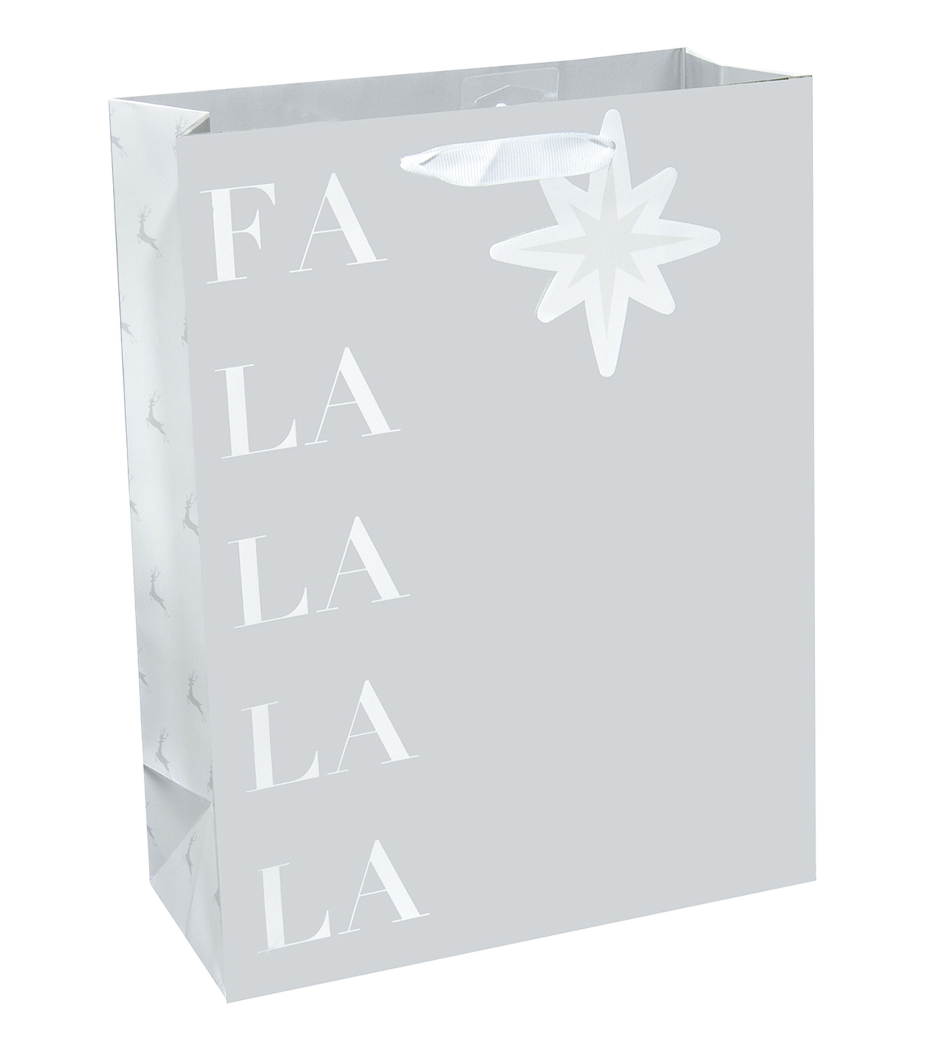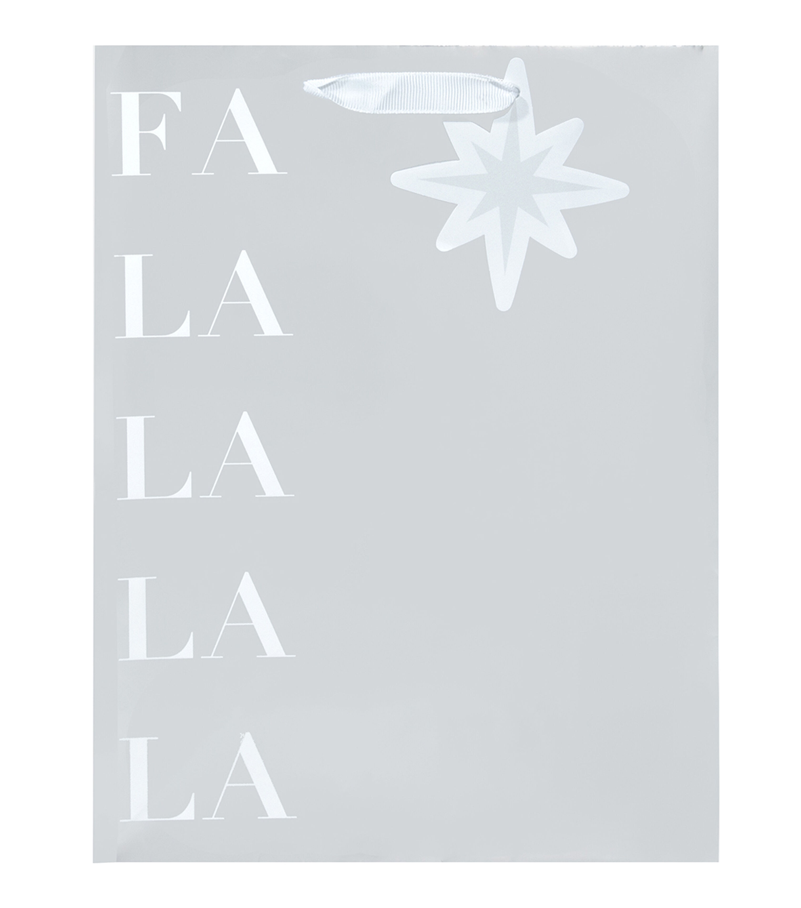 Give a festive touch to the holiday gifts meant for a loved one with the Christmas Fa La La on Silver Gift Bag by Place & Time. This silver-toned gift bag displays the words ‘Fa La La La’ in white. A ribbon handle and a star-shaped gift tag make it perfect for the Christmas gifting ritual.