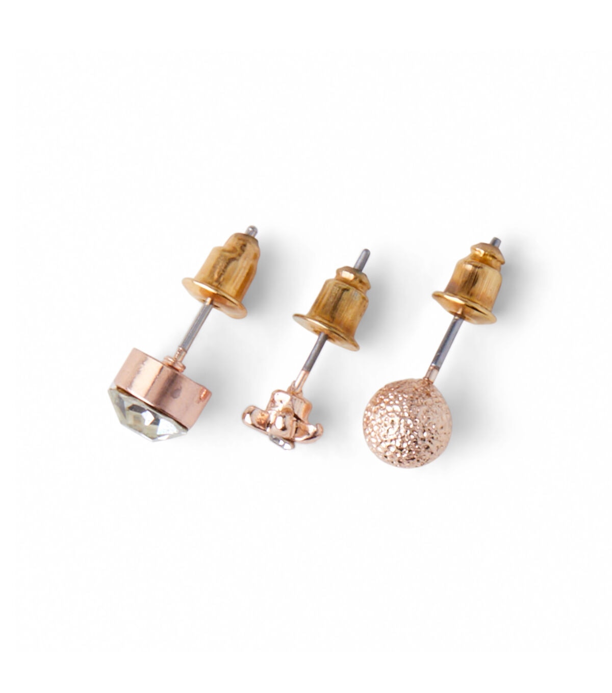 Wear these Hildie & jo earrings every day of the week.. There are twelve pair in all. Nine post earrings, each one is unique. They vary in shape and size from circle to star to knot. Three pair are hoops which also vary in size. All are in gold. 12 pair