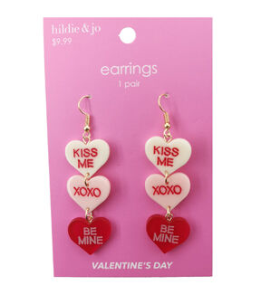 Add the Valentine's Day Dangle Conversation Heart Earrings by hildie & jo to your jewelry collection. These dangle earrings are designed with three heart-shaped accents that sport white, red and pink shades. The words ‘Kiss Me,’ ‘XOXO,’ and ‘Be Mine’ are printed on each of the hearts. They will make you look beautiful when you team them with a little red dress and a pair of stilettoes.