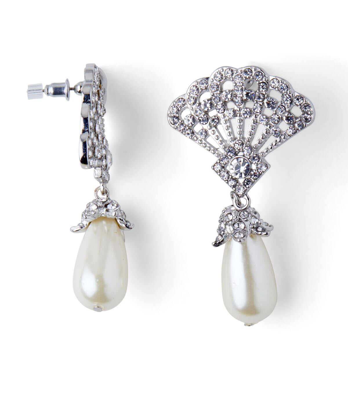 Enhance the appearance of your ears with these hildie & jo Ornamented Silver Earrings-Pearl Teardrop. These earrings bear a silver fan shape at the top and teardrop pearls at the bottom. The silver mold is accented with crystals for a sparkling effect. This pack contains a pair of pearl earrings made of acrylic, glass and zinc alloy.