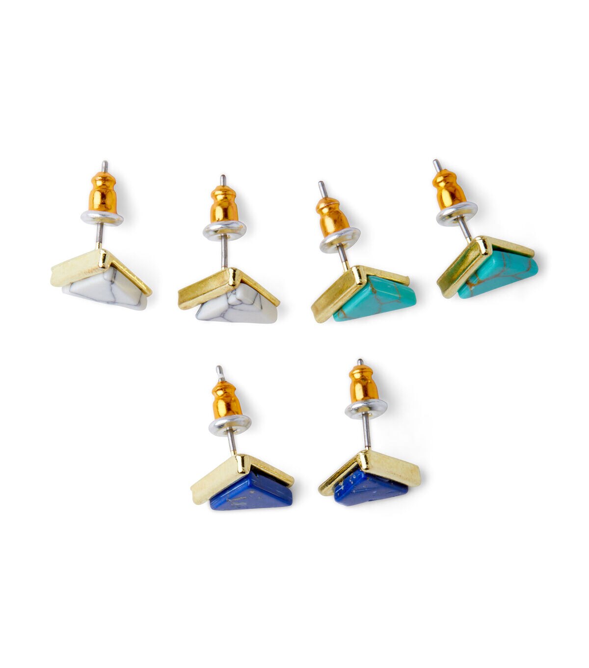 Look trendy in any attire with the hildie & jo Triangle Gold Earrings. Each earring is shaped in a triangle with the outer edge carved in smooth gold. One pair bears a white stone with gray marbling, then a turquoise stone with gold marbling and finally, a blue stone with tan marbling. This pack contains three stud earrings in assorted sizes made of brass, stone and zinc alloy.
