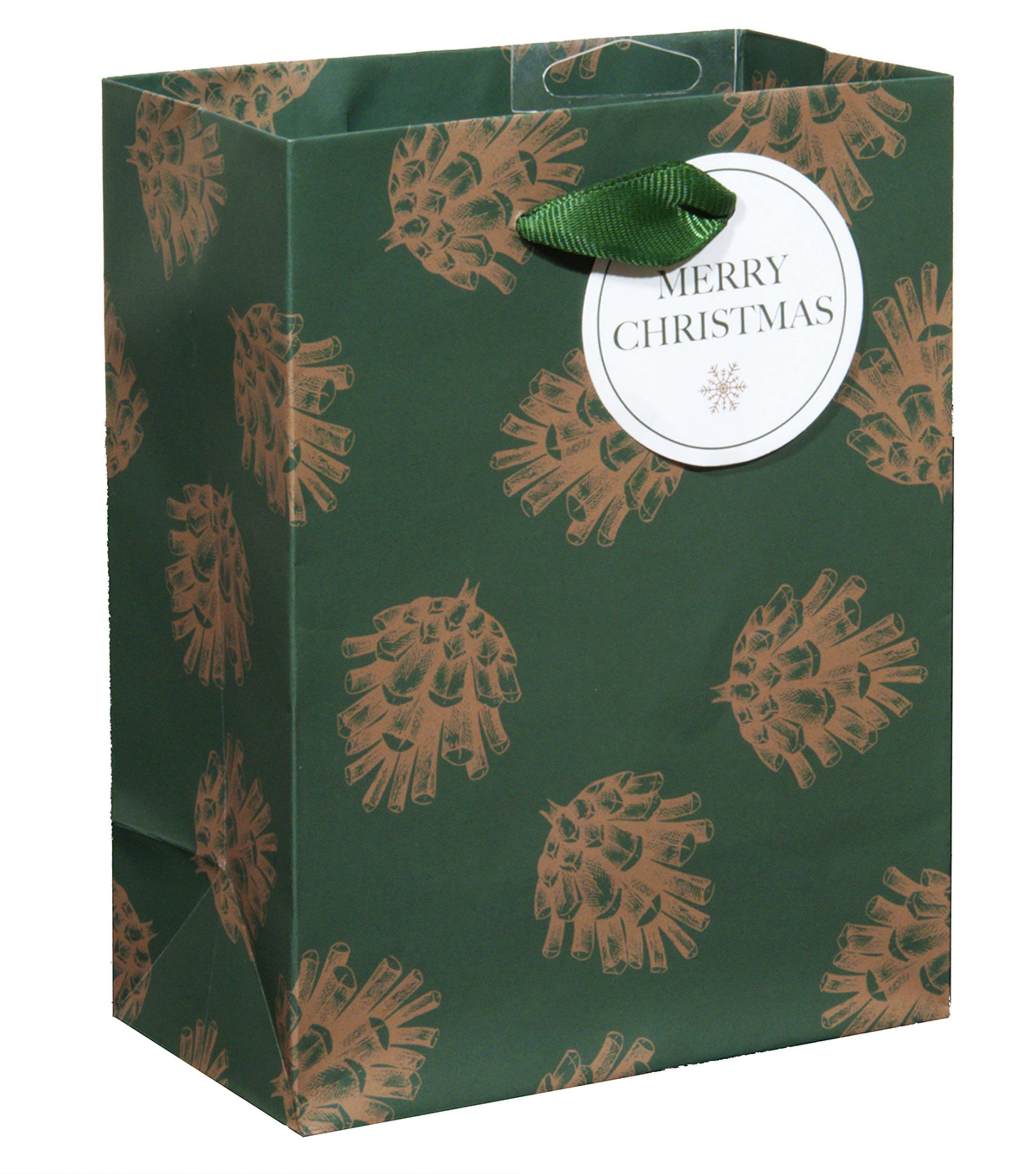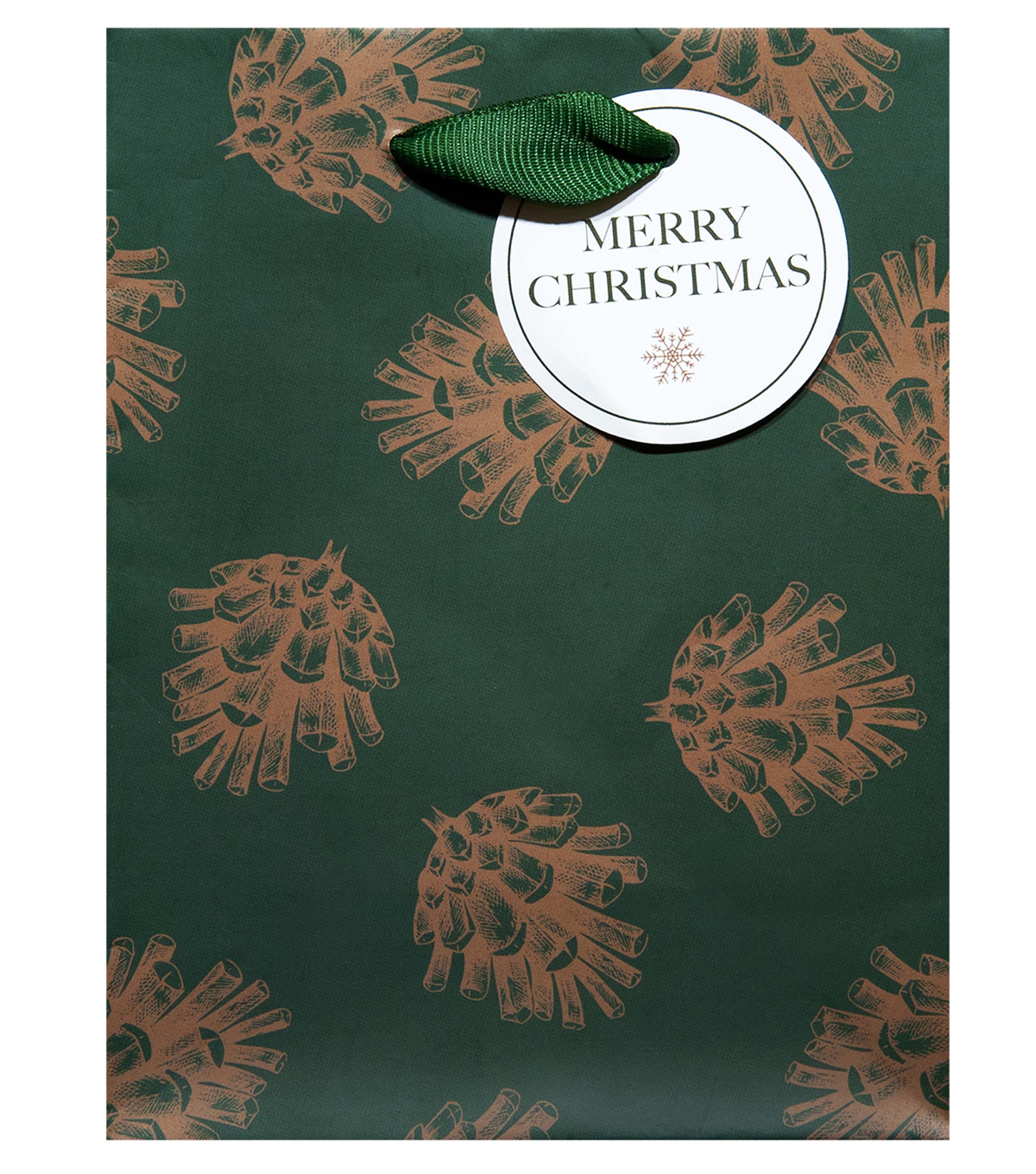 The Christmas Pinecones on Green Gift Bag by Place & Time will surely add a personalized touch to special Christmas presents meant for your loved ones. This gift bag in green sports an allover print of pinecones in brown. It comes with a white gift tag displaying the greeting ‘Merry Christmas’ and a ribbon handle.
