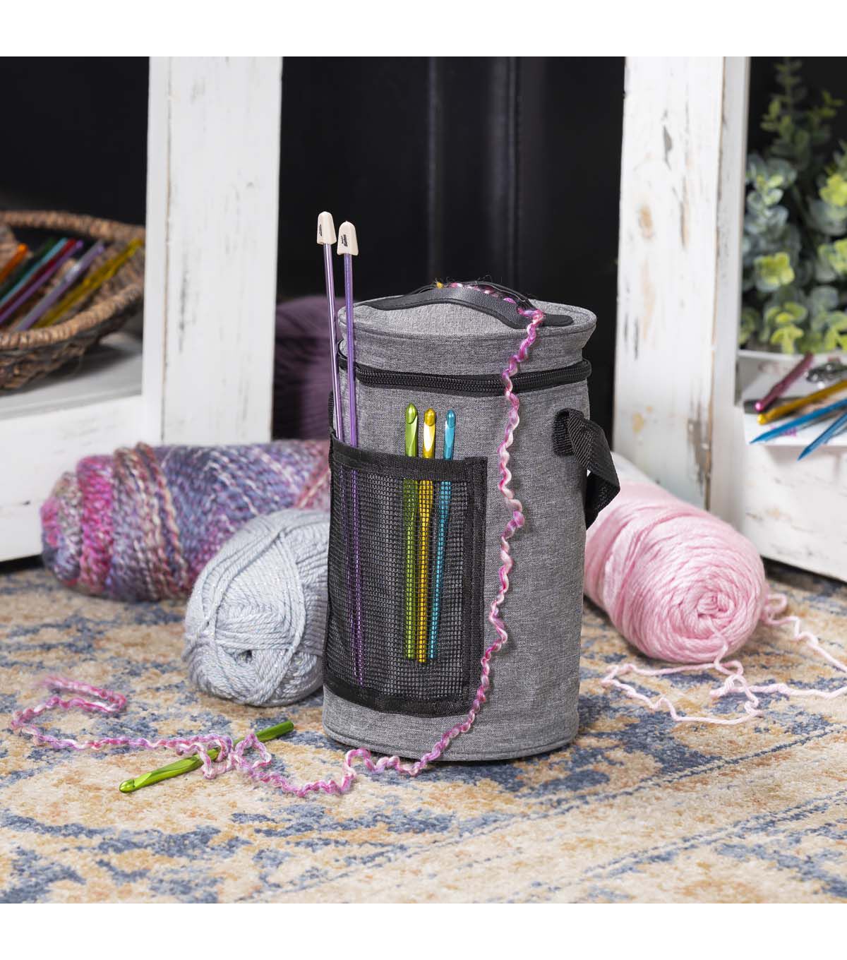 The Big Twist Small Yarn Drum Storage Bag - Gray is just what you need to keep your knitting essentials organized. This drum-shaped storage bag sports a gray shade. You can store yarns, crochet hooks, needles and other items in it. Use the mesh pocket for keeping measuring tapes, keys and more. It is designed with a shoulder strap for ease of carrying and a slit at the top to pull out the yarn.