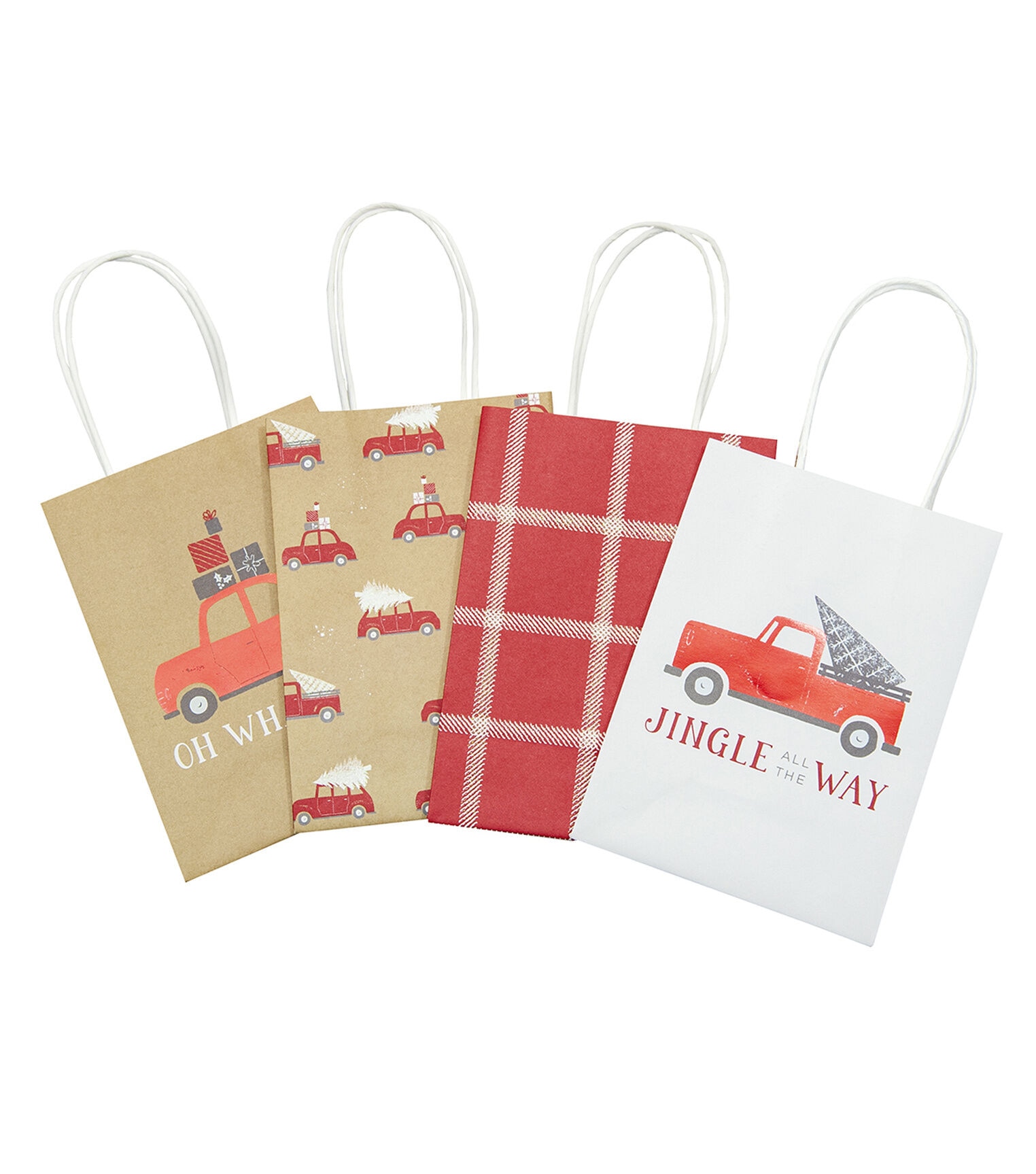 You will love making the Christmas Oh What Fun Gift Bags by Place & Time a part of your gift-wrapping supplies. This pack includes four gift bags. One flaunts an allover print of a car carrying holiday trees or gifts. The second flaunts a print of a car with presents on top and the third displays a truck carrying a Christmas tree. A red gift bag sporting a plaid pattern in white completes the set. Place special gifts in them and present them to your loved ones in style.