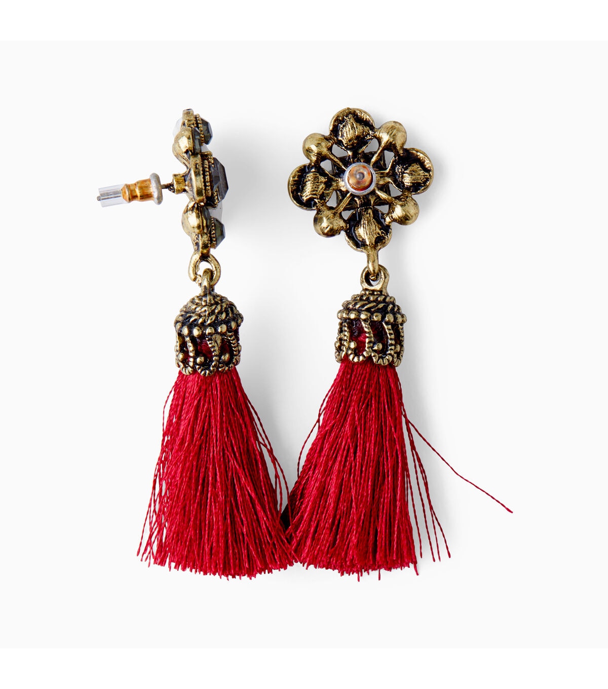 Step up your style quotient with these hildie & jo Antique Gold Earrings-Red Tassel. Featuring a circular shape, these earrings are molded in antique gold with a square crystal stone in the center. The square crystal stone is accented with round crystals on each side for extra visual delight. Dangling at the bottom are deep red tassels with a scroll crown at the top. Wear it with your favorite outfit to complete your look.
