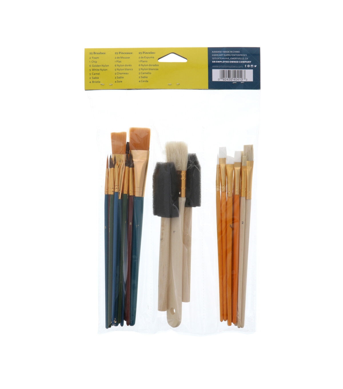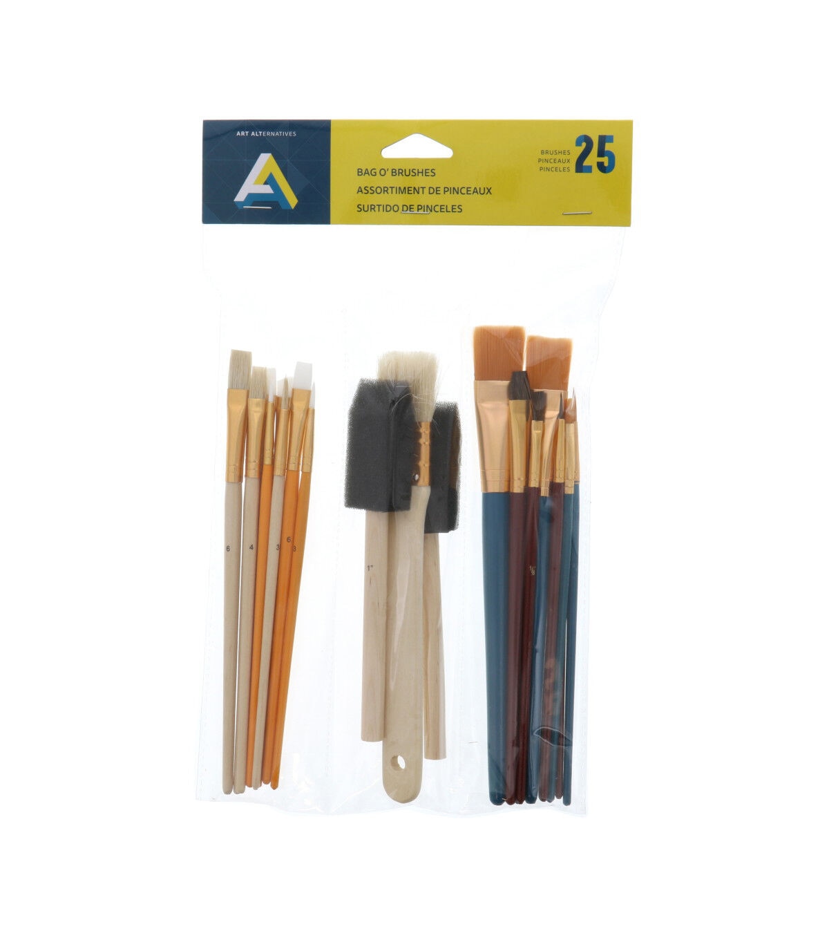 This "Bag o' Brush" is a teacher's dream, and a useful set for beginners and budding artists. This 25 brush assortment features a wide range of choices in filament, size and shape to suit practically any arts and craft need; use with oil, acrylic, watercolor, tempera, gouache and more. This set includes: two 1" foam applicators; a 1" solvent resistant chip brush; six golden nylon brushes (washes, shaders and rounds); five white nylon (two shaders, one each liner, round and angular shader); five camel hair brushes (three rounds and 2 washes); two sable rounds; and four bristle brushes (three flats and a round).