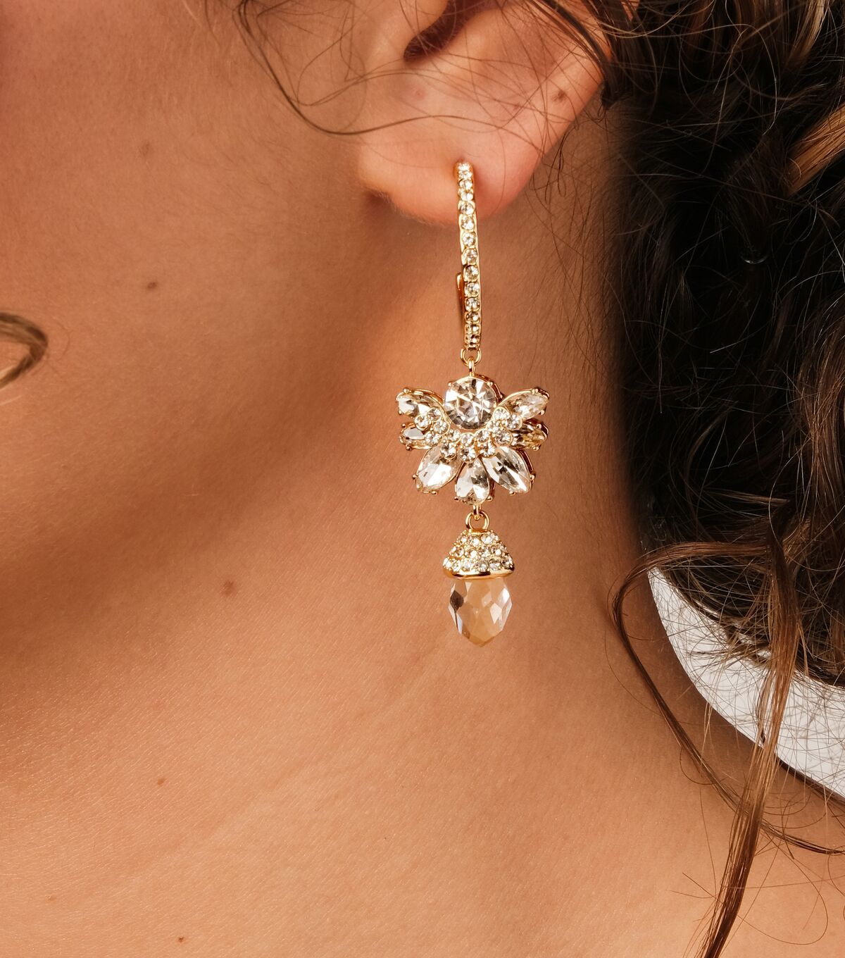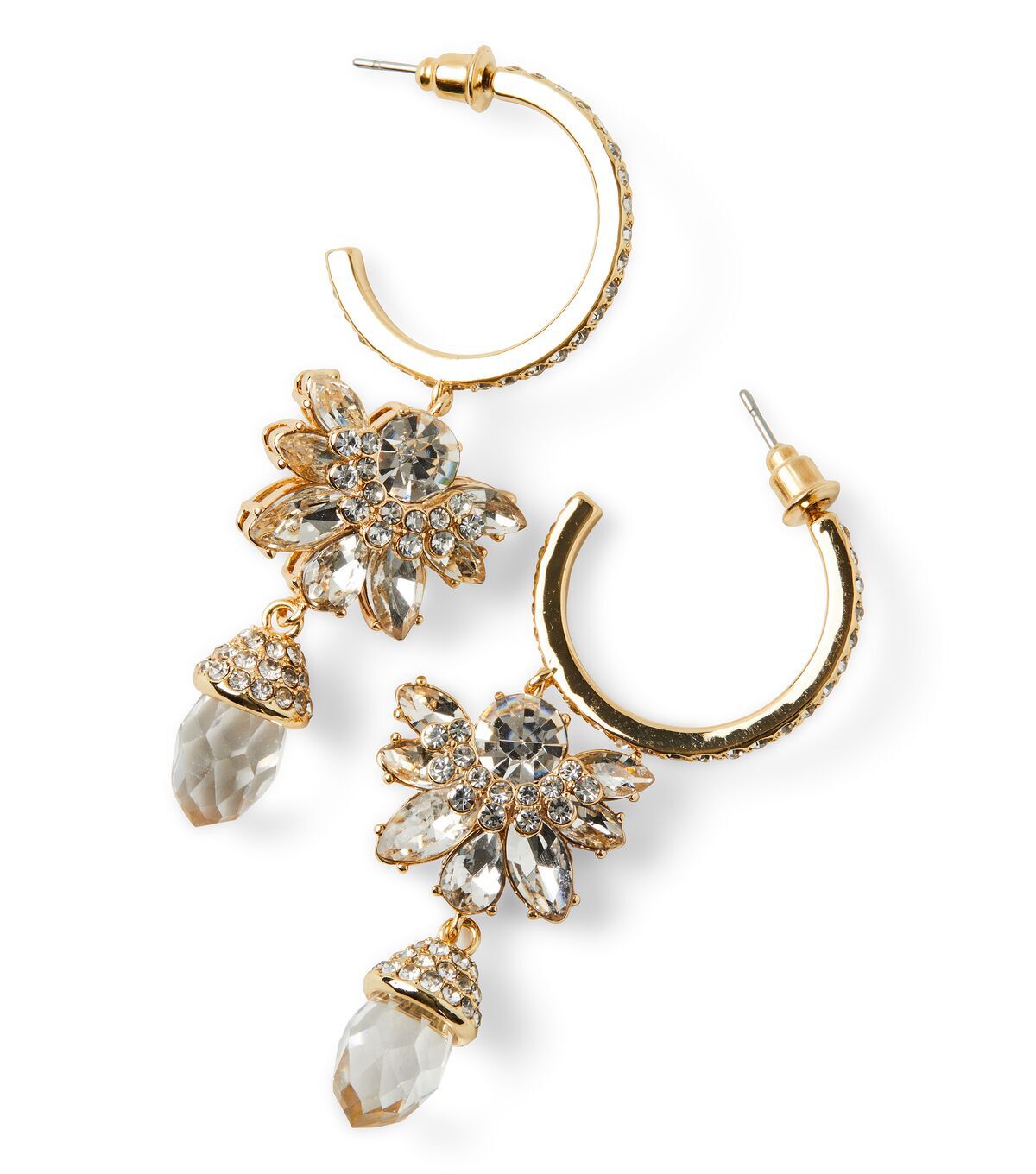 Stand out for your elegant sense of style wearing the Badgley Mischka Hoop Cluster Earrings. These hoop cluster earrings have flower-shaped accents studded with clear faceted stones and a dangling pink glass solitare that catches the light with every move. With their unique appeal and sparkle, they will make great accessories for parties or weddings.
