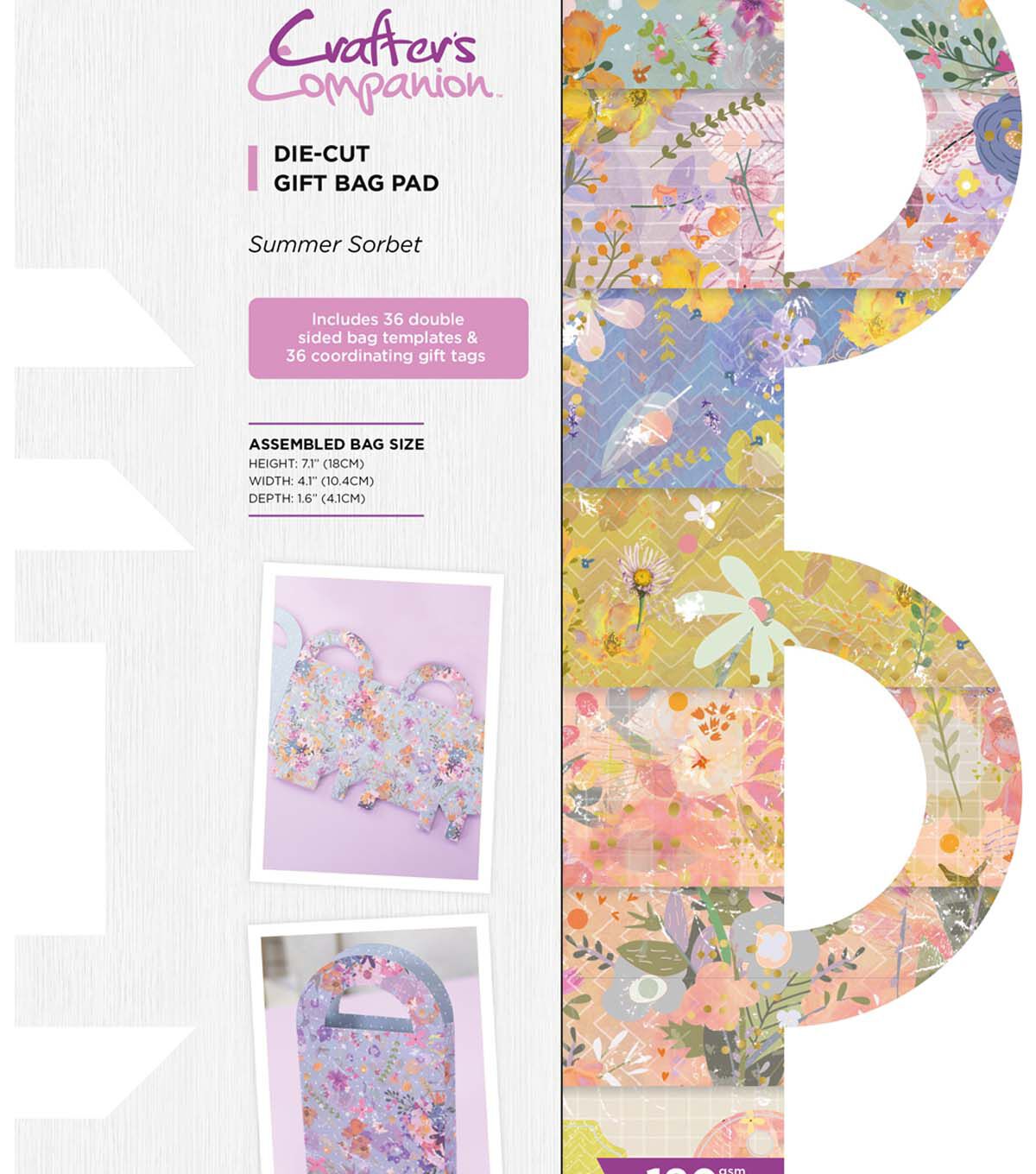 This Summer Sorbet Die-Cut Gift Bag Paper pad is from Crafter's Companion. This paper pad includes 72 pieces. There are 36 double sided bag templates with 36 coordinating gift tags. These bags are easy to put together, you just need to fold on the pre-scored lines to create your bags.