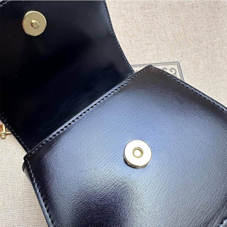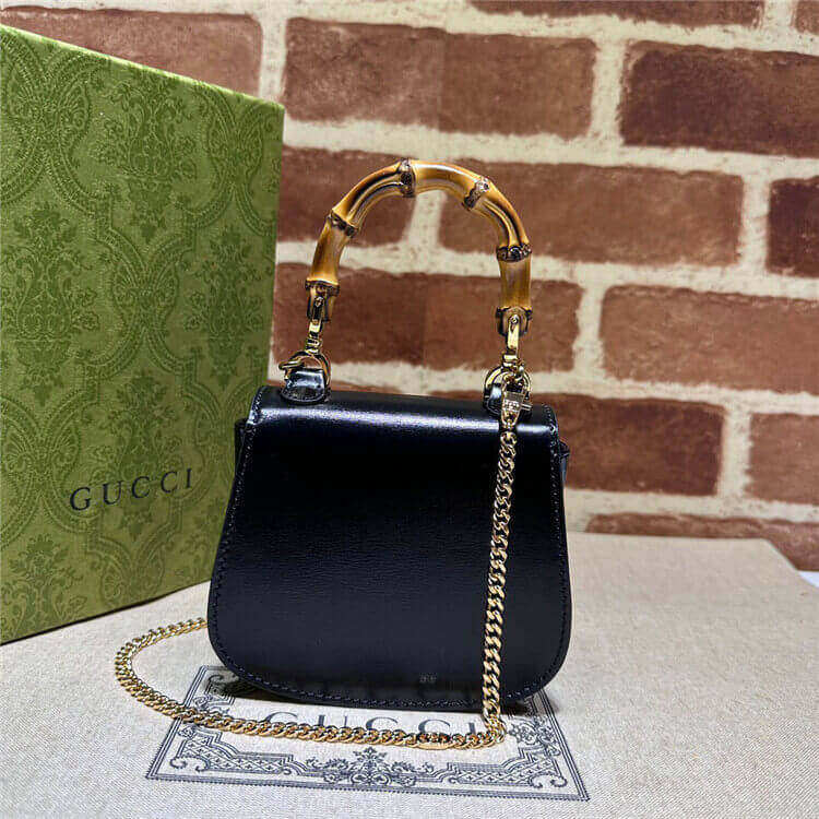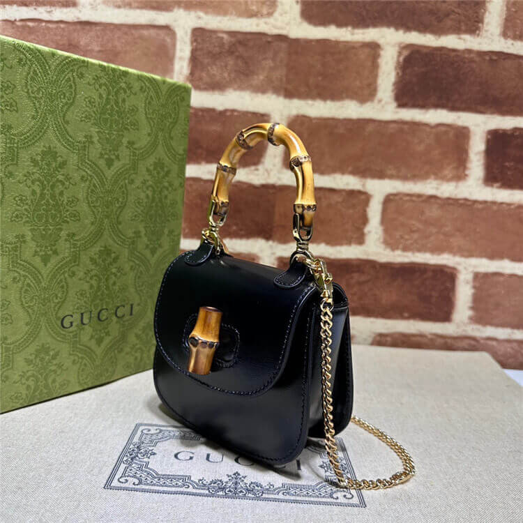 1:1 Mirror Quality Replica Gucci Bamboo 1947 Super Mini Bag Style:760246 10O0X 1000 Black leather Antique gold-toned and bamboo hardware Microfiber lining with suede-like finish Bamboo top handle with 2.5″ drop Detachable chain shoulder strap with 22″ drop Bamboo closure 4.7″W x 7.3″H x 2.2″D