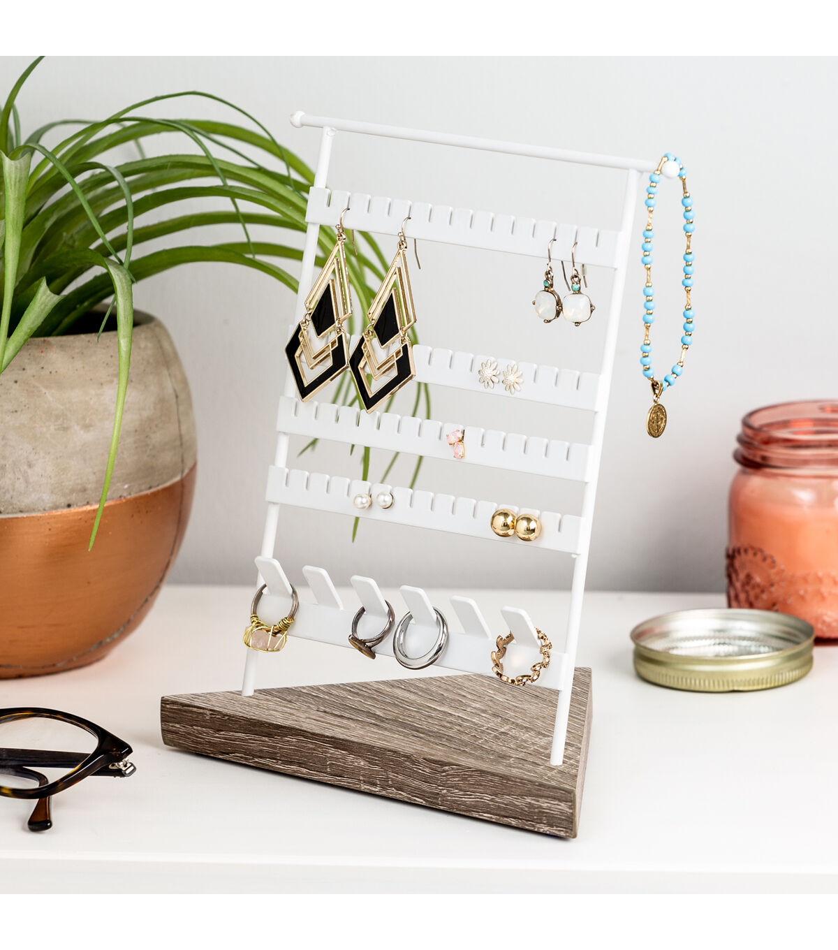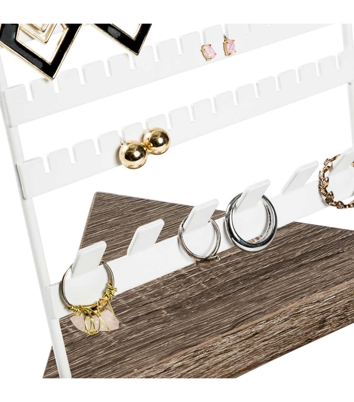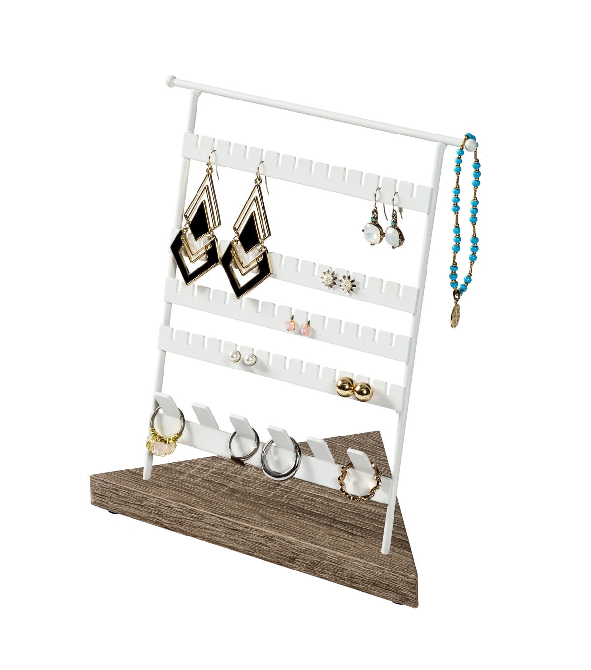 Your favorite rings and earrings keep you looking so good, but when it's time to take them off for the night you never have anywhere put them. This jewelry stand holds up to 28 earrings and at least 6 rings, where you can securely store all your favorites, both new and old. Those rings grandma handed down to you that make you feel so good when you slip them on now have an appropriate place to call home.