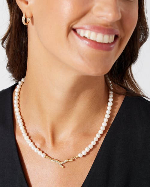 Shining pearls and a sparkling coral design keep the sea close to the heart, in a necklace that's sure to pair perfectly with your favorite dress.