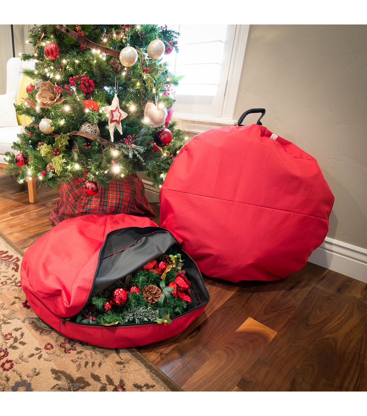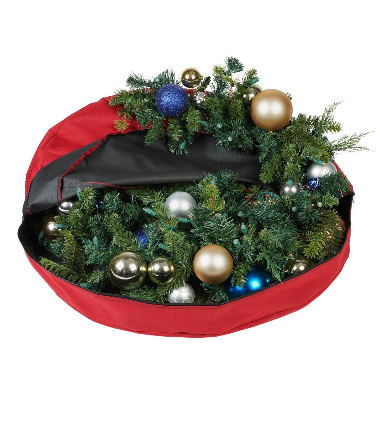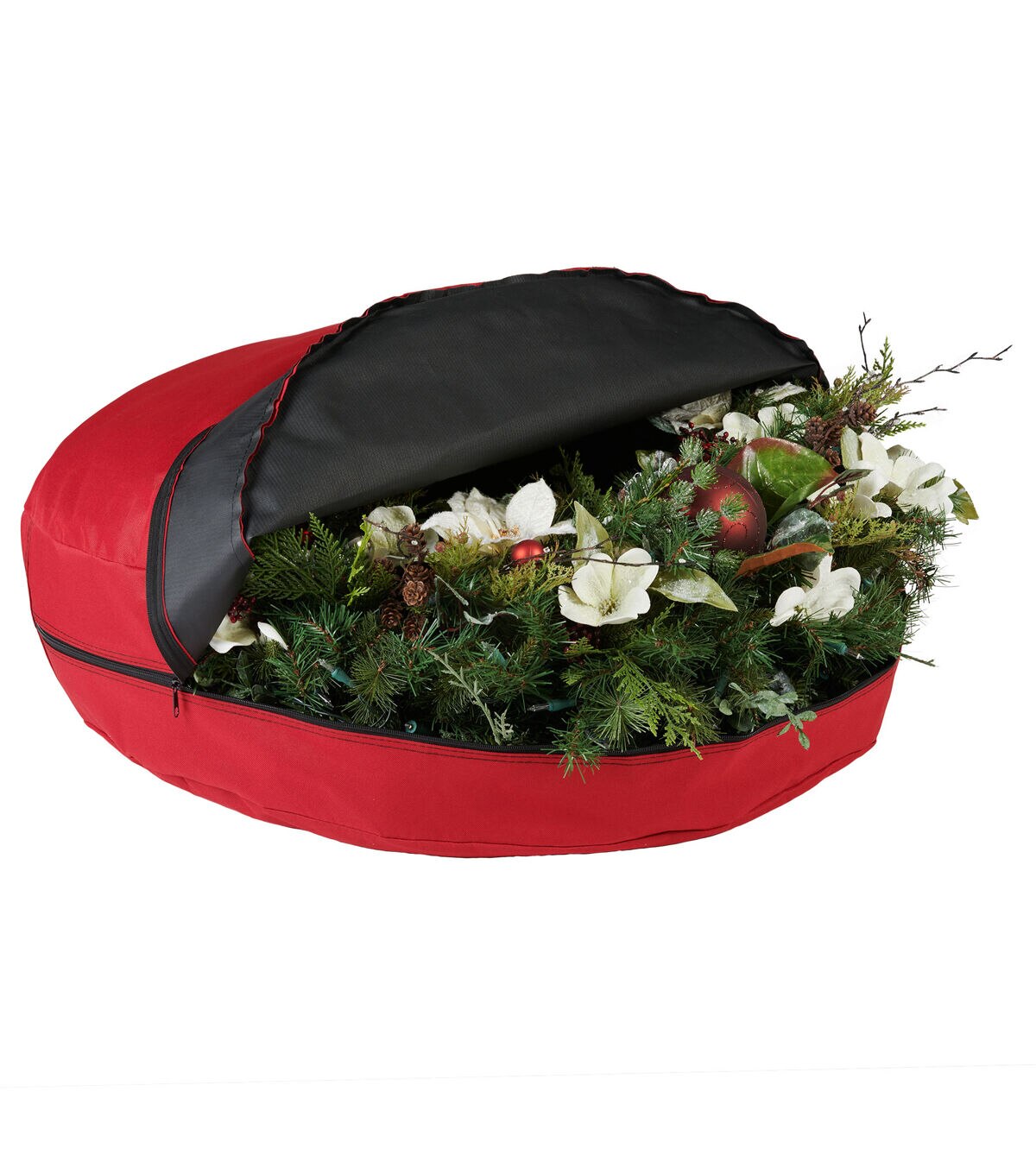 A wreath can often lose its original glamour not from its time in use, but from its time in storage. When you pull out a Christmas wreath from storage to see that it has been flattened or bent you are understandably saddened. All the loose artificial pine needles falling out everywhere is also frustrating. To add to this, no amount of fluffing of the branches seems to get it back into the right shape. The Direct Suspended storage bag eliminates the danger of storing your beautiful wreaths. Your small and large wreaths, up to 36 in., are safe from being smashed as the Direct Suspend system attaches to the frame of the wreath inside the bag. This means the wreath is hanging up in storage like it would be in use, keeping it from sagging to the bottom of the bag and becoming disfigured. To keep your wreath safe through the seasons the storage bag is made of durable Polyester fabric that is easy to wipe clean. If your wreath is one of those large beautiful beasts with a heavy frame, the bag’s carrying handle is padded to keep your hands safe. It will be easy to slide your wreath in and out of the bag because of its large wrap around zipper. This durable bag will keep your wreaths suspended, happy, and vibrant through the years saving you from buying replacement wreaths in the near future.