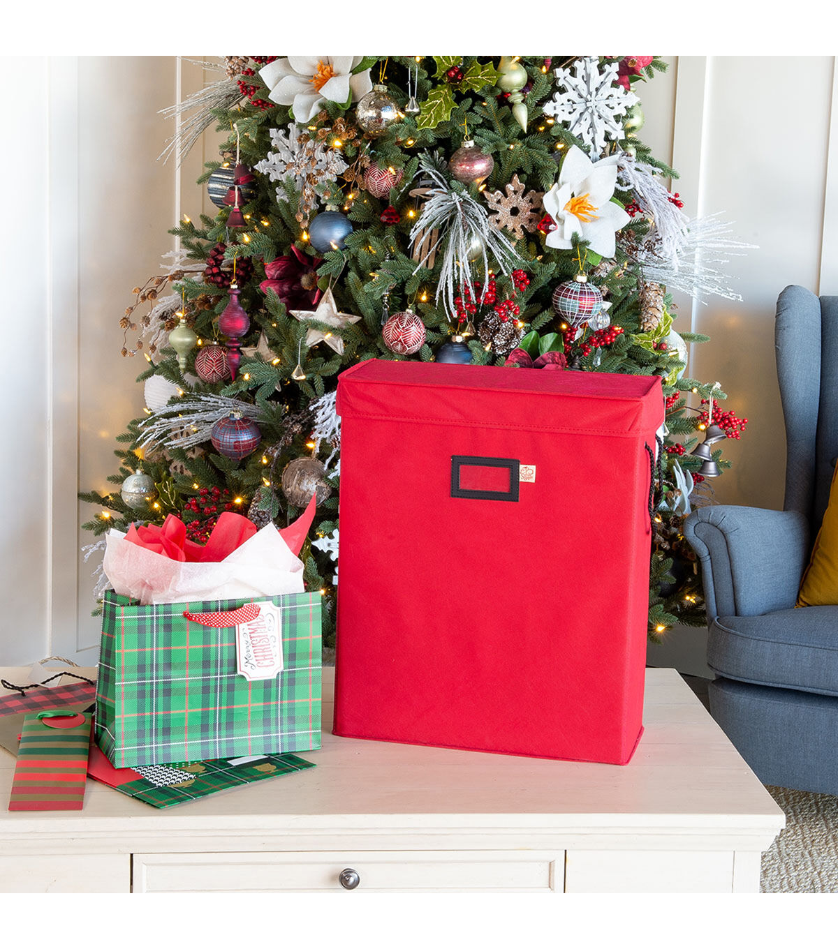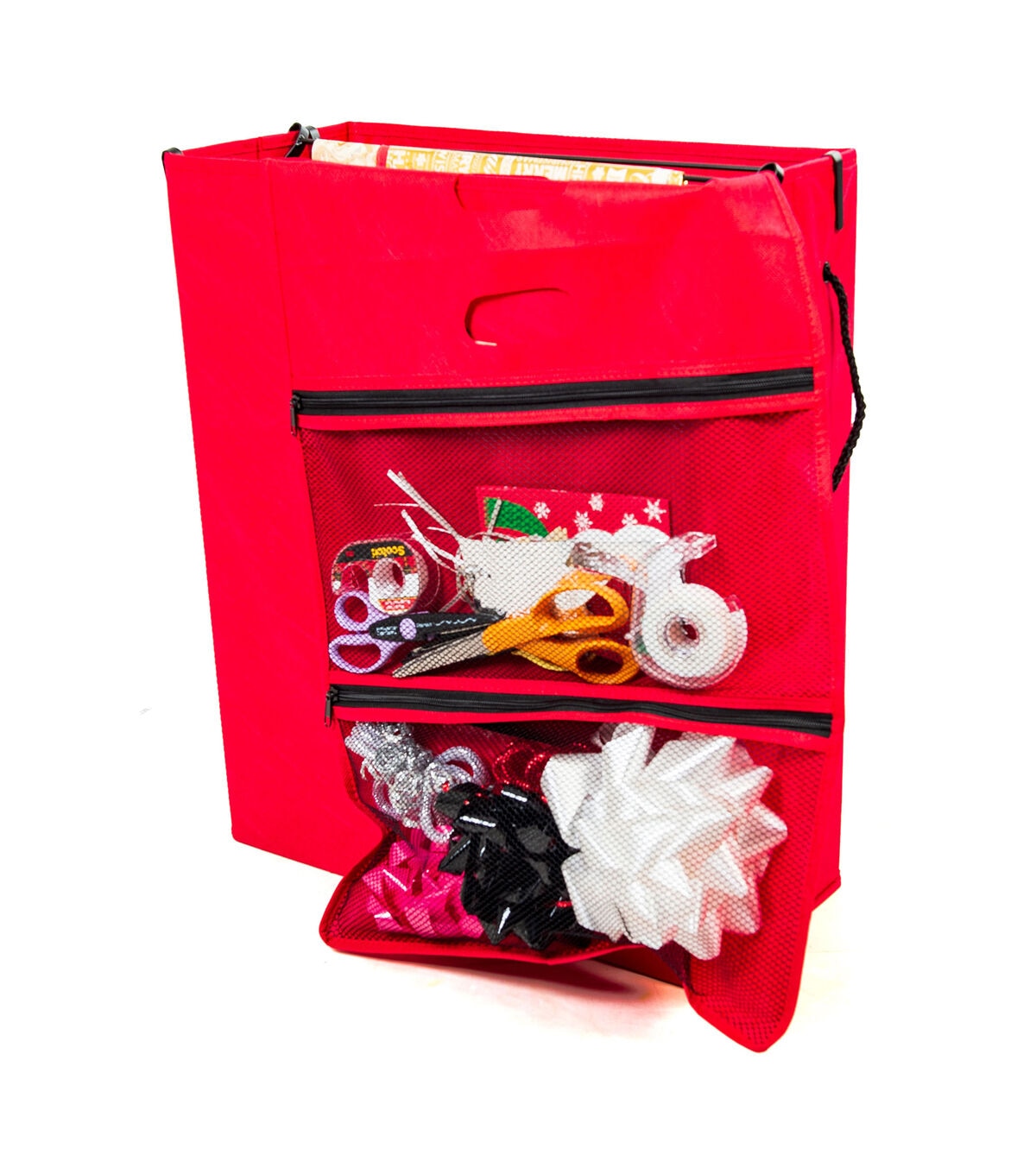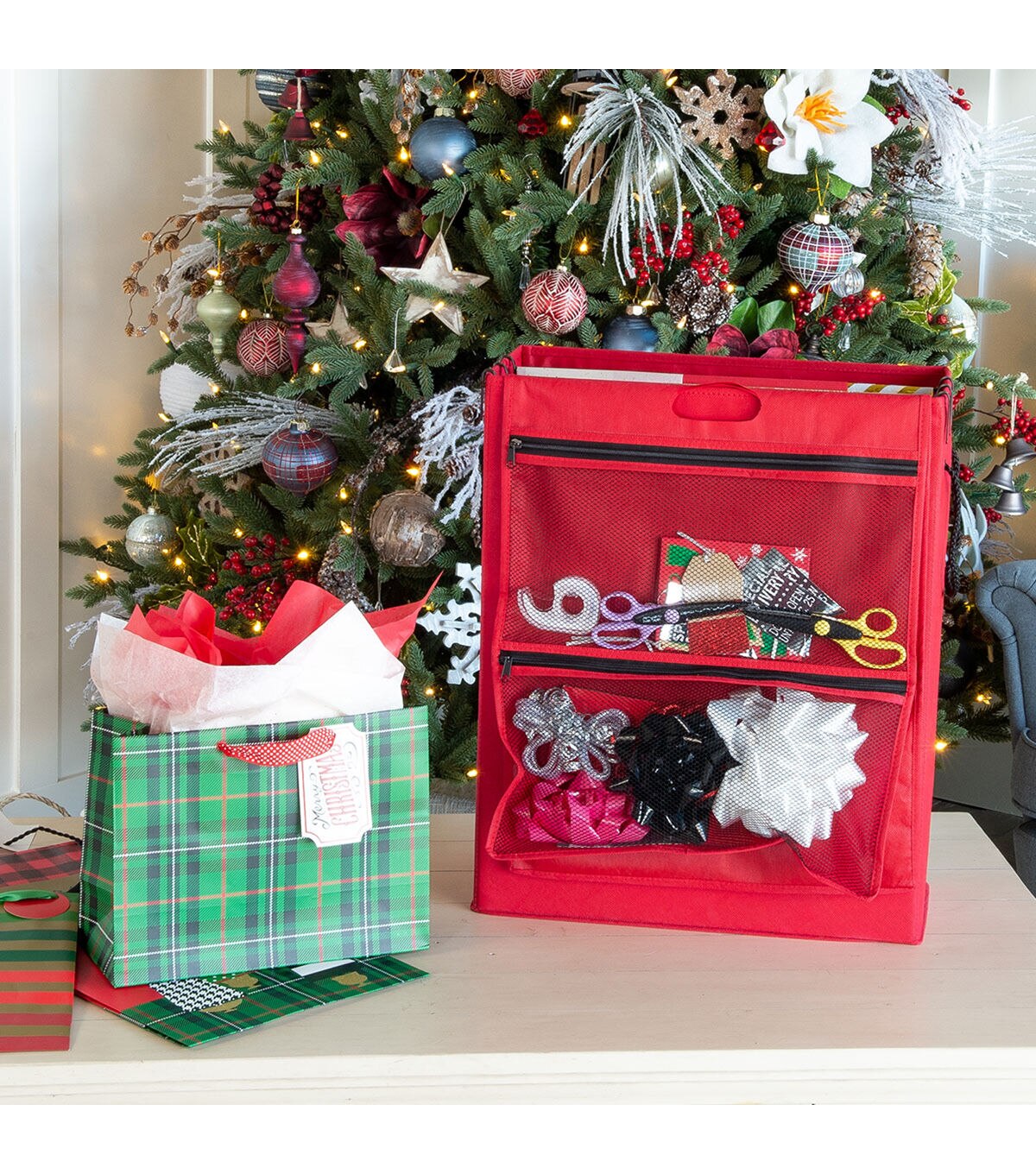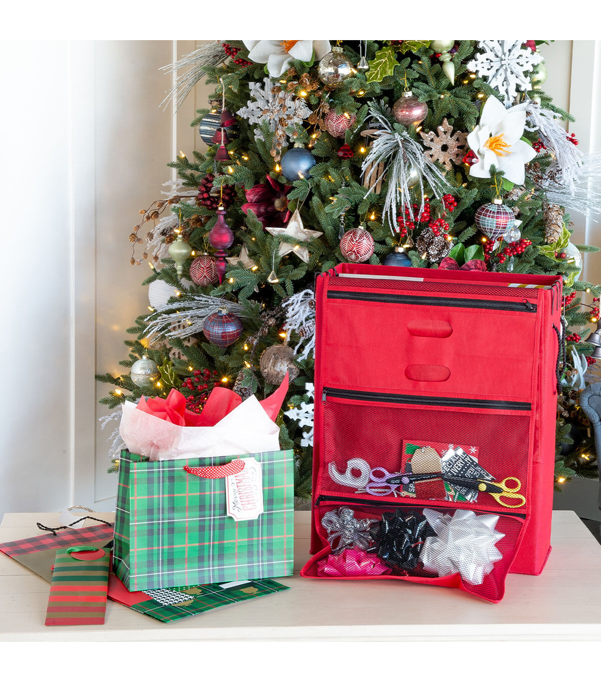 Gift bags are a great thing to collect. If you run out of time to wrap or your gift is too odd of a shape for wrapping paper, gift bags are a quick solution, but you always run into trouble protecting the gift bags from crumpling up or remembering where you stored them. The Gift Bag and Tissue Paper Storage Box is perfect for saving your bags, tissue paper, and wrapping supplies in an orderly fashion. The box has three movable rods to adjust the storage space for the bags. Two rods are for hanging tissue paper to prevent folding and wrinkling. A large accessory pouch with four zippered pockets hangs off the third rod, and are great for storing supplies such as scissors, tape, pens, and bows. On the front of the box is an ID window to place tags listing its contents to help keep track of your bags and reminds you, or others, what is inside. The box can easily be carried with the beautiful braided carrying handles. If your ready to collect gift bags and keep them safe and organized all year round, this storage box is just what you need.