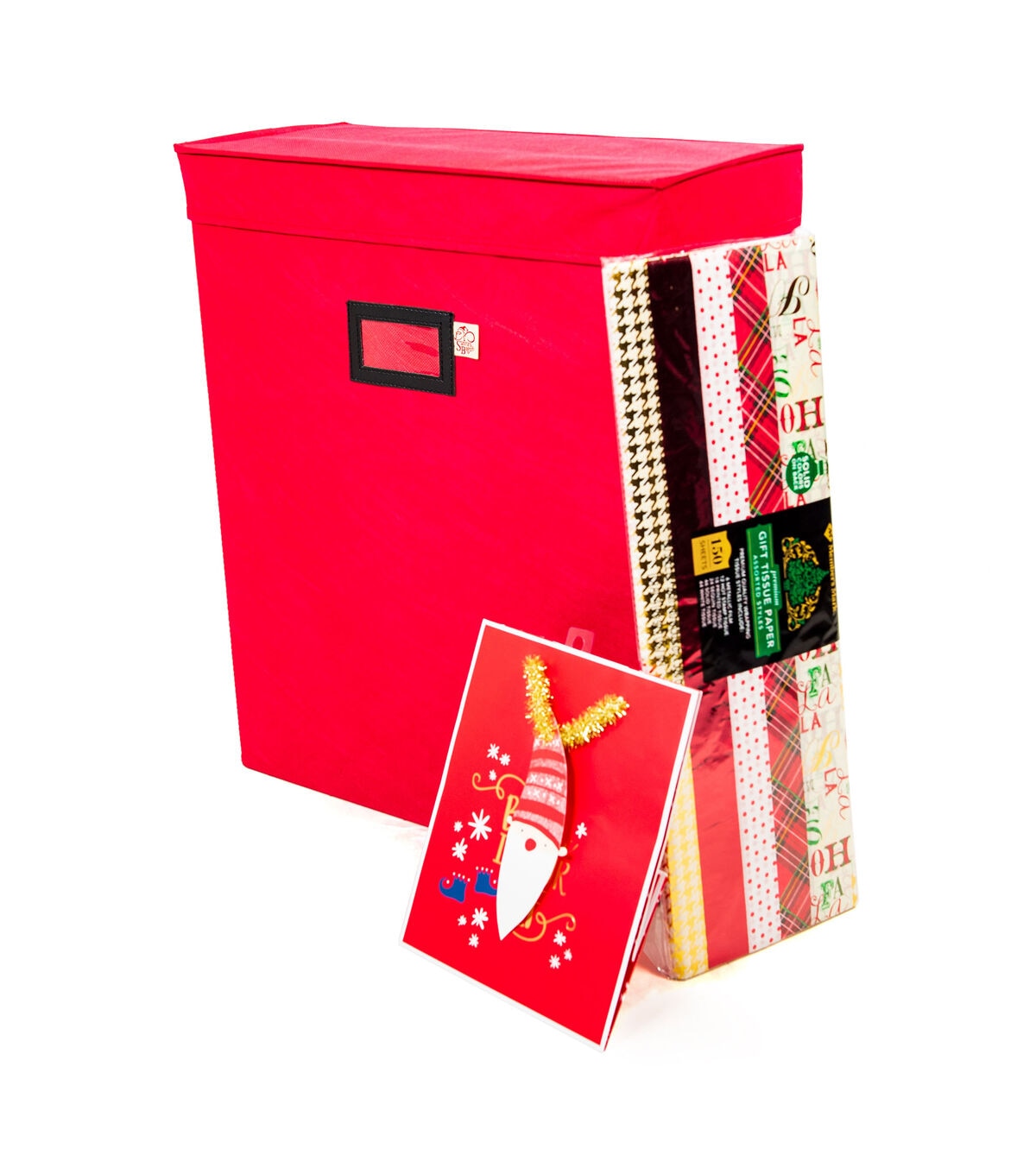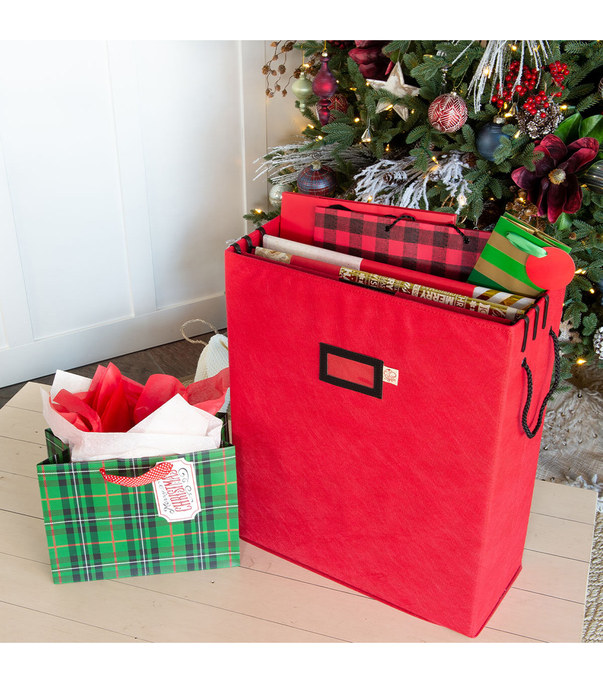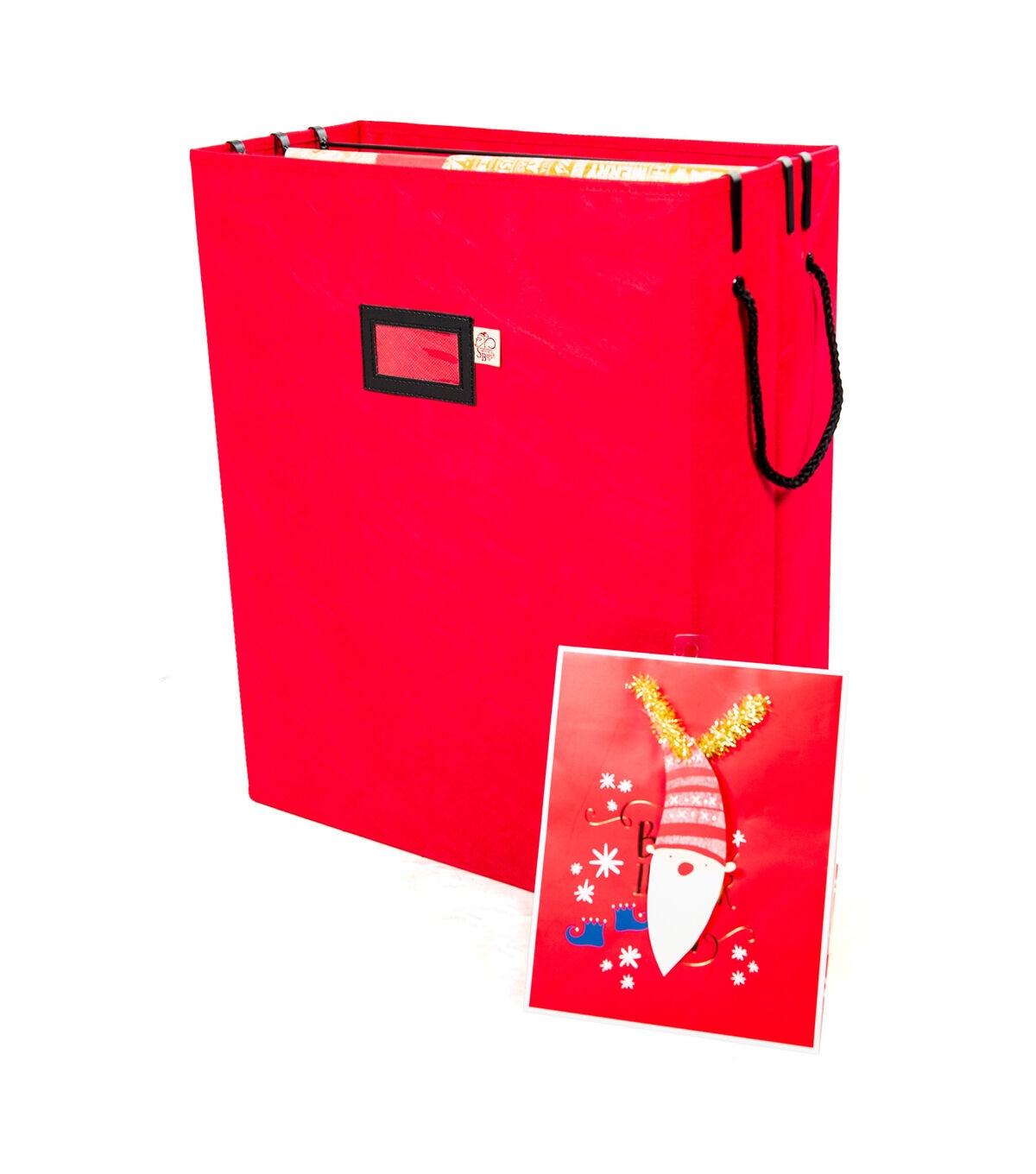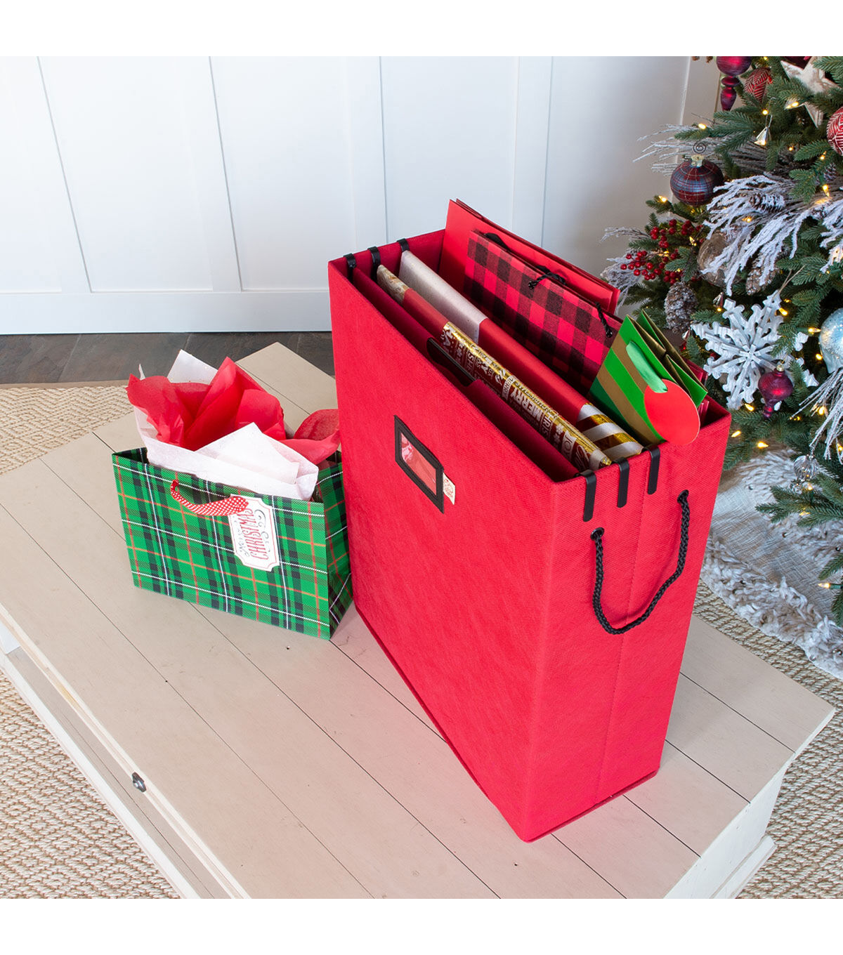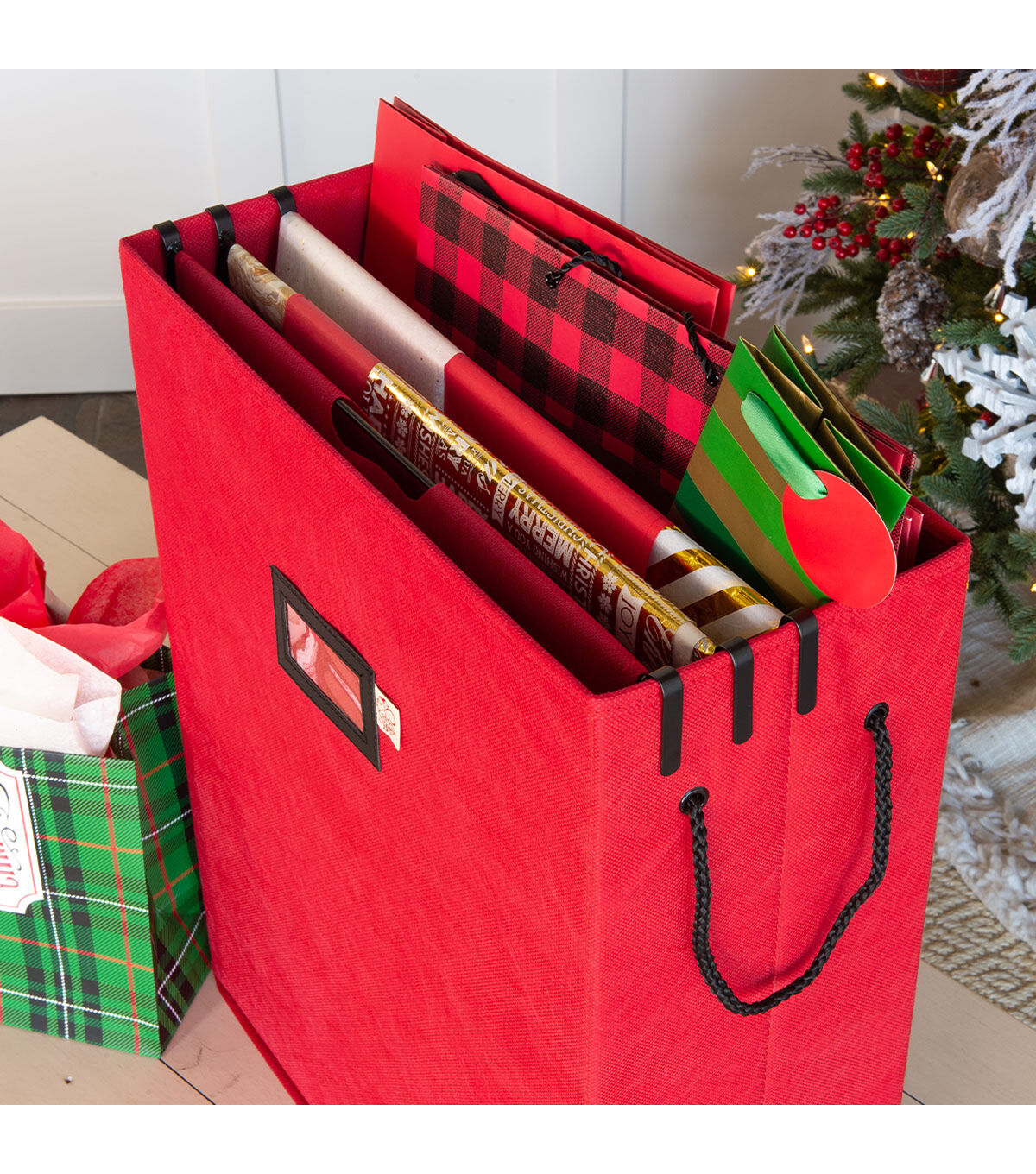 Gift bags are a great thing to collect. If you run out of time to wrap or your gift is too odd of a shape for wrapping paper, gift bags are a quick solution, but you always run into trouble protecting the gift bags from crumpling up or remembering where you stored them. The Gift Bag and Tissue Paper Storage Box is perfect for saving your bags, tissue paper, and wrapping supplies in an orderly fashion. The box has three movable rods to adjust the storage space for the bags. Two rods are for hanging tissue paper to prevent folding and wrinkling. A large accessory pouch with four zippered pockets hangs off the third rod, and are great for storing supplies such as scissors, tape, pens, and bows. On the front of the box is an ID window to place tags listing its contents to help keep track of your bags and reminds you, or others, what is inside. The box can easily be carried with the beautiful braided carrying handles. If your ready to collect gift bags and keep them safe and organized all year round, this storage box is just what you need.