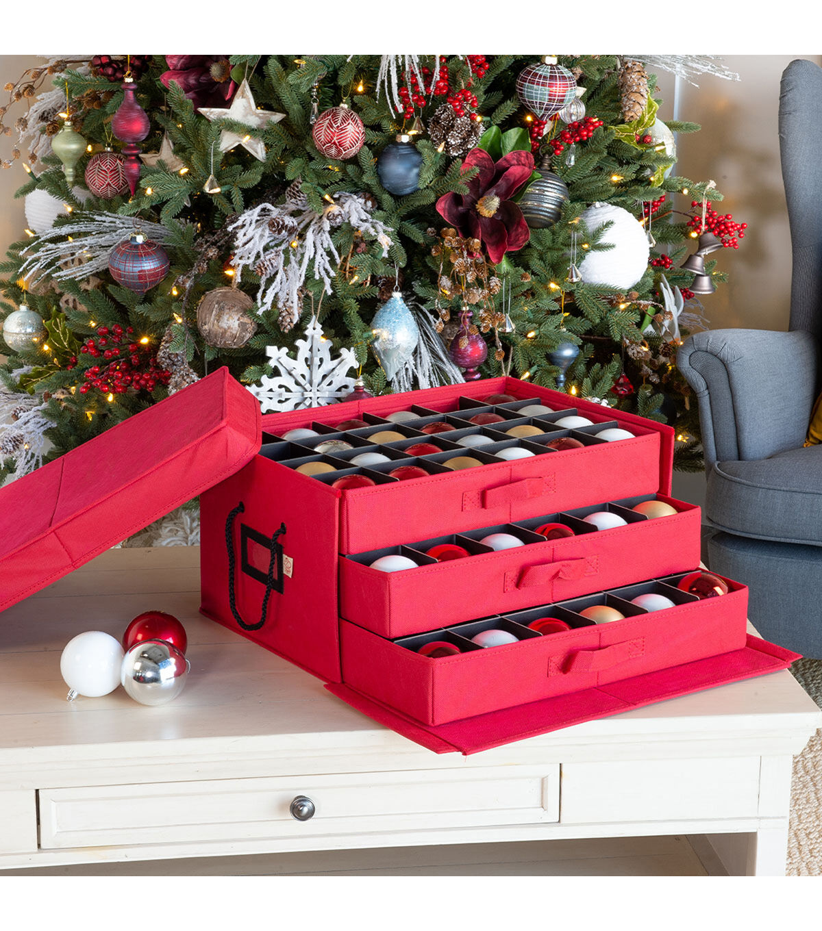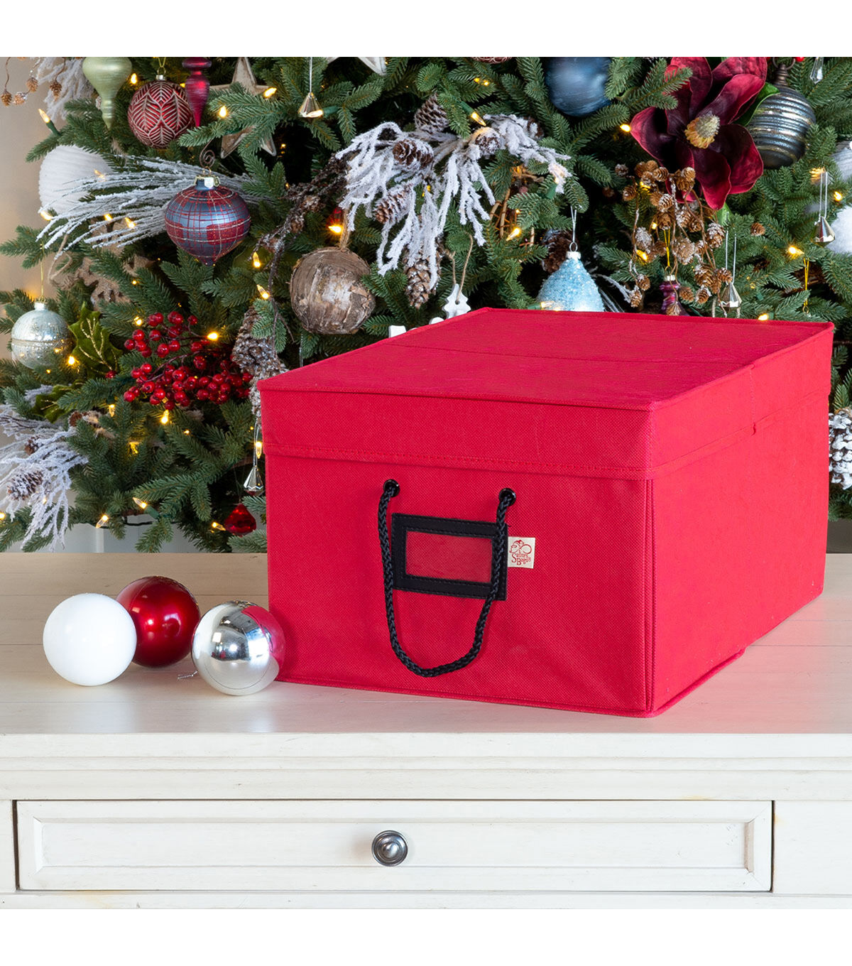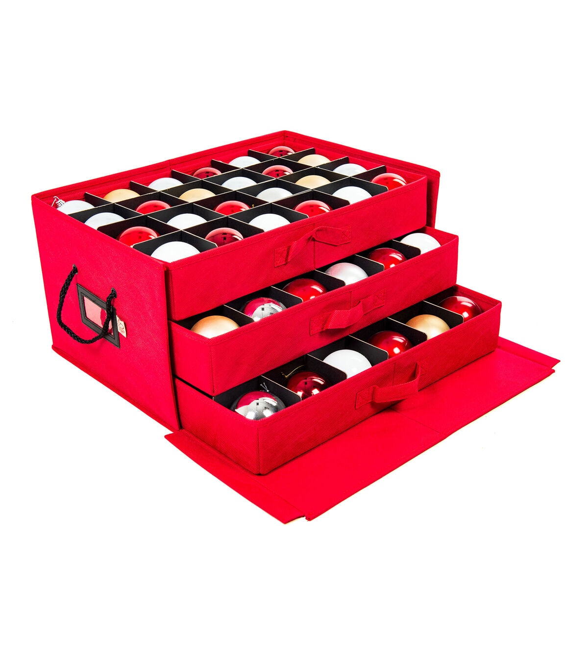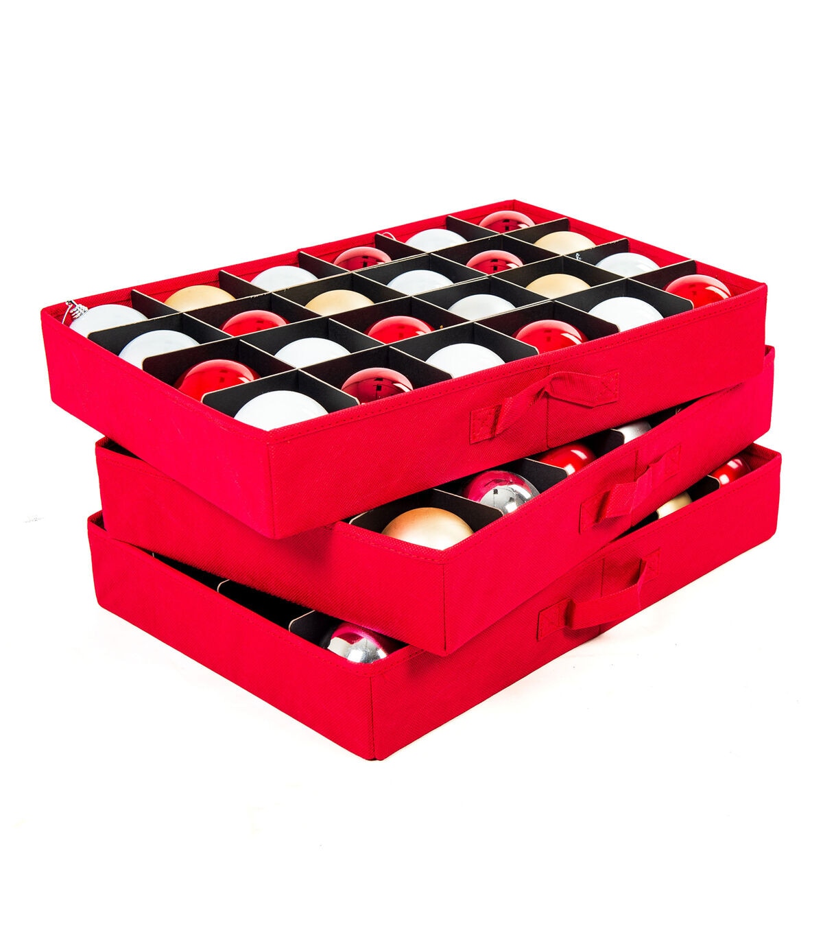 You’re used to that large box of Christmas ornaments that have been wrapped in newspaper and crammed together in the messiest game of Tetris ever, however, you know this doesn’t work. Ornaments will inevitably be crushed or will be discolored by the acid found in the very paper you used to try and protect the ornaments with. We completely relate to the frustration attempting to box all your ornaments in one place while protecting their fragility. The Three Drawer Ornament Box will hold your ornaments safe and organized all year long. The lightweight box holds 72 3 in. ornaments, 24 in each tray, with dividers between the ornaments. The trays and dividers are acid-free to protect the vibrant colors of your ornaments from damage and discoloration. While decorating the tree, the trays can be removed and individually carried allowing you to place the ornaments onto the tree right out of the drawer. To keep track of your ornaments the front of the box has a clear ID window for tags listing the contents of the box. The ornament storage box features a decorative exterior pattern with matching braided rope carrying handles. The three drawer ornament box will keep your ornaments safe and shining year after year.