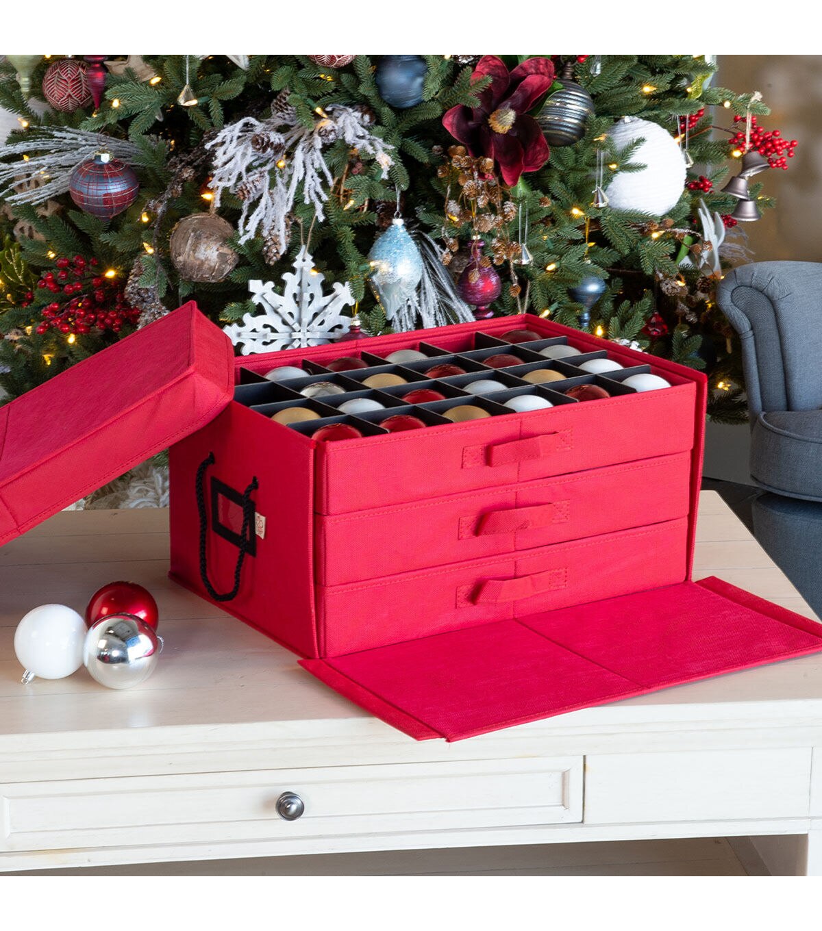 - Acid-free trays prevent ornament discoloration