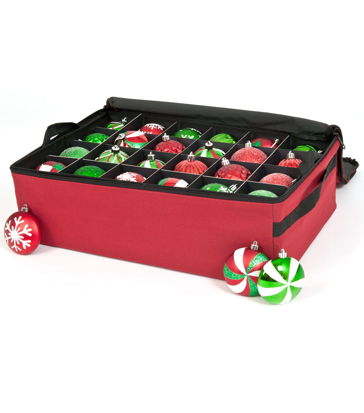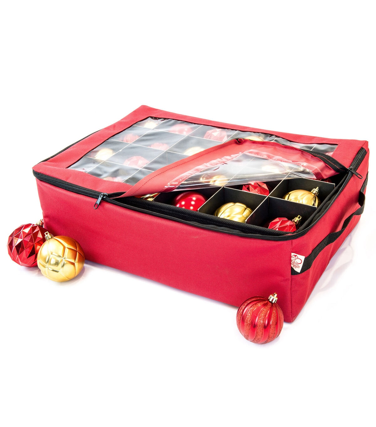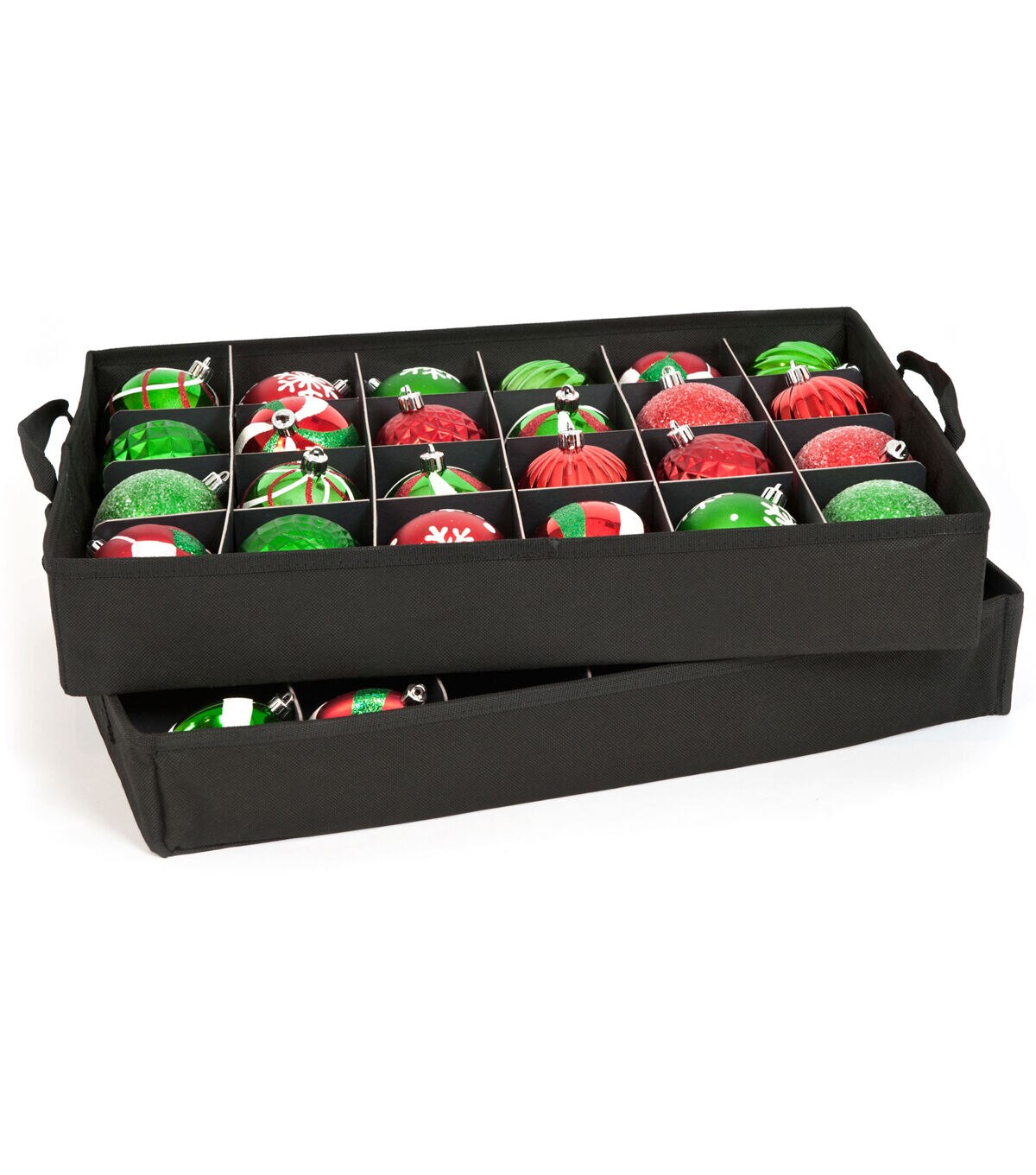 When you wrap your ornaments up in tissue paper or newspaper, your ornaments are not as safe as you may think. Wrapping your ornaments in paper and placing them into boxes leads to ornaments breaking as we all becoming discolored from the acid in the very paper you used to try and protect those ornaments. On top of this, the wrapping process takes a long time to finish and unpack the next Christmas. The Two Tray Ornament Storage Bag is a durable storage container holding up to 48 (3 in.) ornaments. The two trays are lined with acid-free fabric to prevent damage and discoloration of your ornaments. In addition to carefully cradling each ornament, the trays are removable to make it easier to walk around the tree placing ornaments. Each year, you can easily view the ornament storage bag's contents through the large clear plastic window on the top of the bag. The durable polyester fabric will keep dust and moisture out. This box is perfect for protecting your sentimental and precious ornaments in storage for the whole off season.