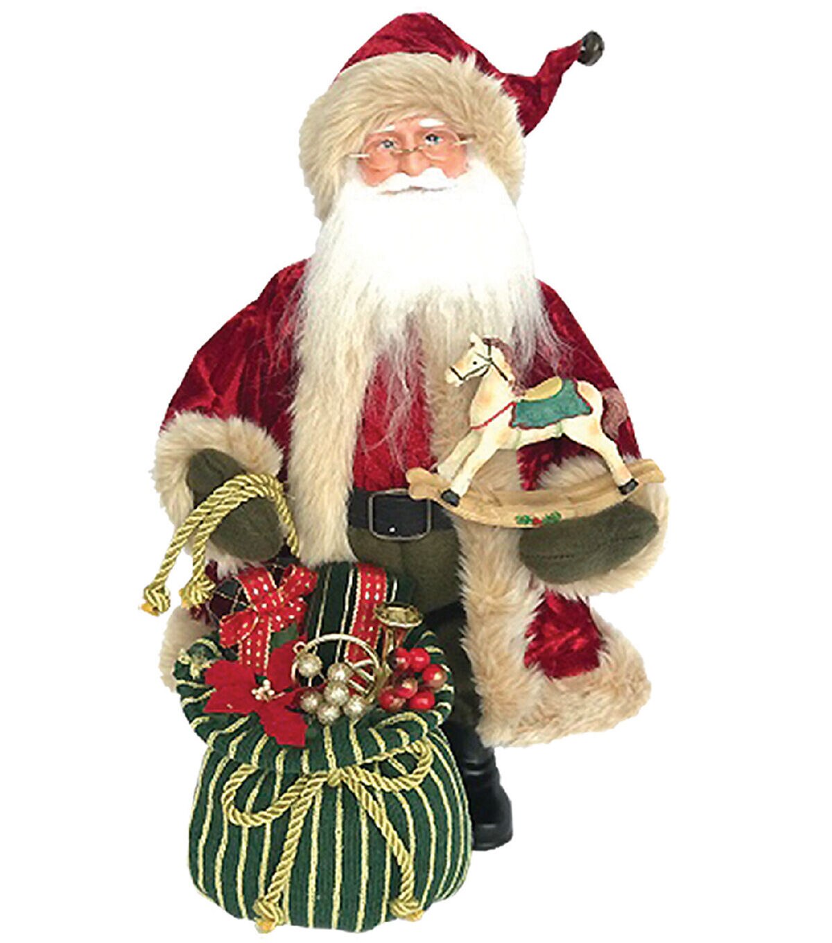 It's every child's dream as they drift off to sleep on Christmas Eve . . . waking up to see Santa Claus carrying an armload of presents to place under their Christmas tree. This Santa is wearing his traditional red coat and hat, and carries a rocking horse toy in one hand and a large bag of gifts in the other. Make your holidays the best ever with this wonderfully handcrafted and hand painted 15" Bag Full of Toys Claus.