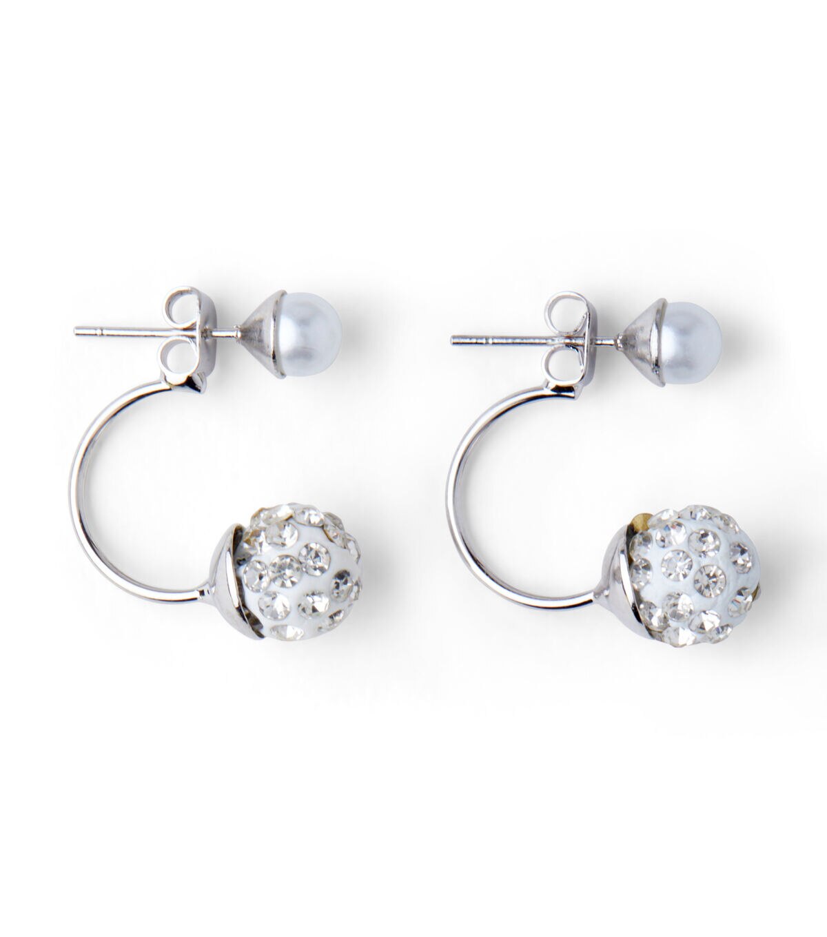Express your unique sense of style with the hildie & jo Silver Earrings-Pearl Bead with Clear Crystals. It's got a round pearl stud on the top, and a silver hoop coming from the back to the front, with a white bead encased in clear crystals on the end. This pack includes one pair of earrings made of glass, brass and fimo.