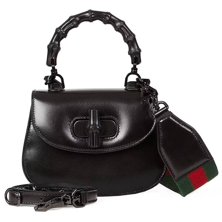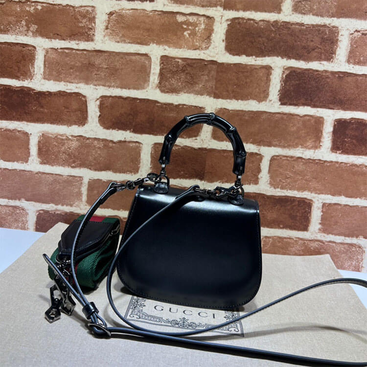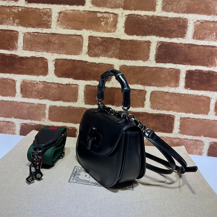 1:1 Mirror Quality Replica Gucci Bamboo 1947 Mini Top Handle Bag Style:686864 10ODP 1060 Black leather Antique gold-toned and bamboo hardware Lining: leather Inside: card holder Handle drop: 3.1″ Detachable strap with 21.7″ drop Mini size: 6.7″W x 4.7″H x 3″D The model is 5’6″ tall