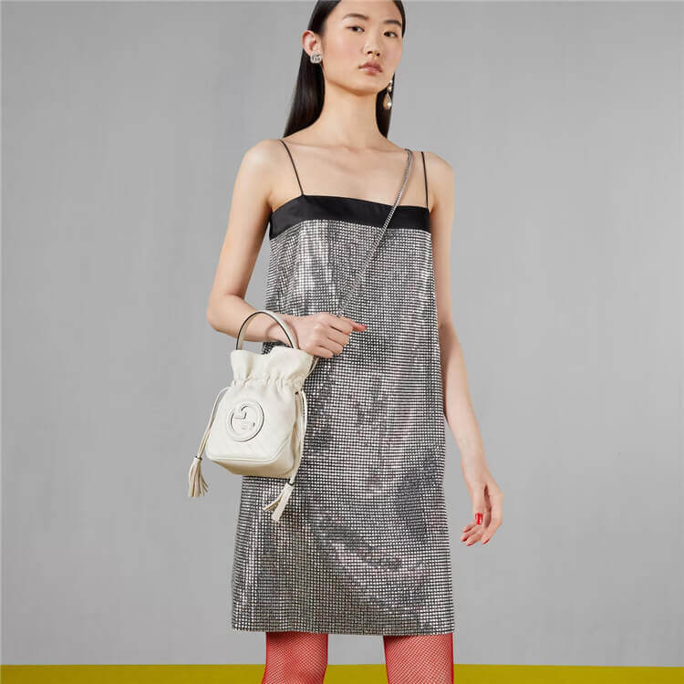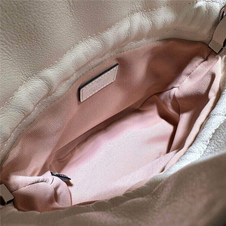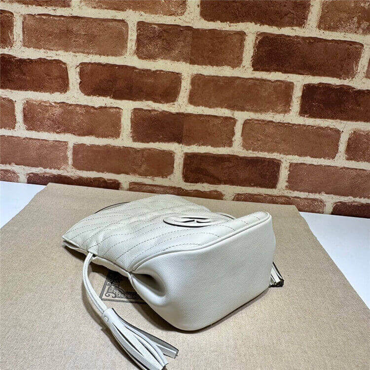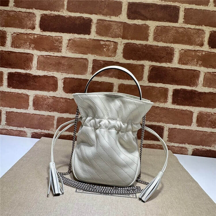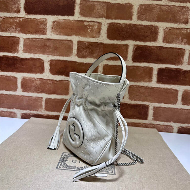 1:1 Mirror Quality Replica Gucci Blondie Mini Bucket Bag Style:760313 AACP7 9022 White leather Taffeta lining Round Interlocking G leather patch Leather tassels Top handle with 8cm drop Detachable chain shoulder strap with 55cm drop Drawstring closure W15cm x H19cm x D8cm