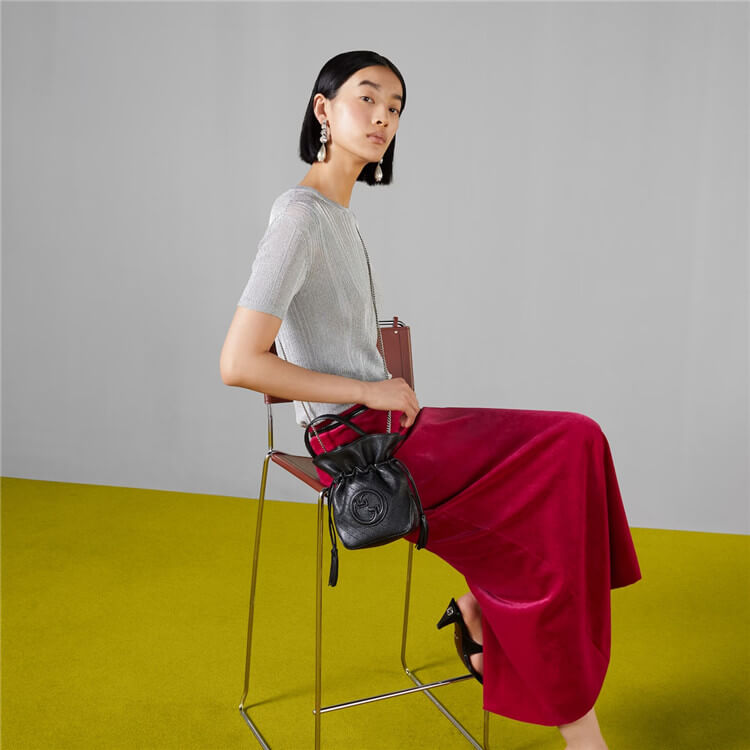 1:1 Mirror Quality Replica Gucci Blondie Mini Bucket Bag Style:760313 AACP7 1000 Black leather Taffeta lining Round Interlocking G leather patch Leather tassels Top handle with 8cm drop Detachable chain shoulder strap with 55cm drop Drawstring closure W15cm x H19cm x D8cm