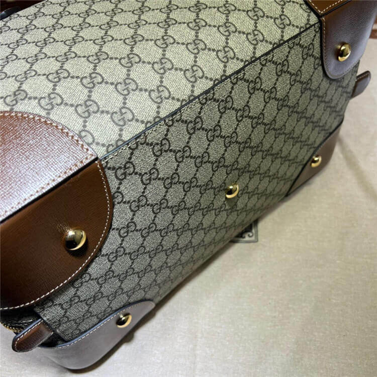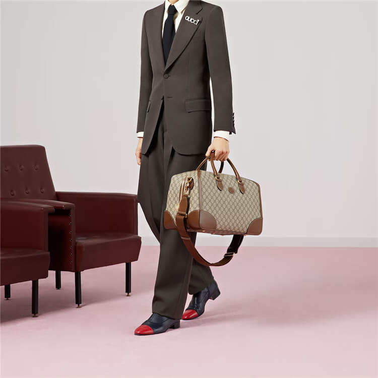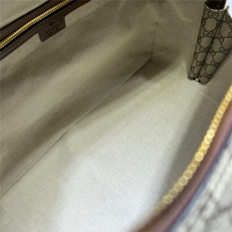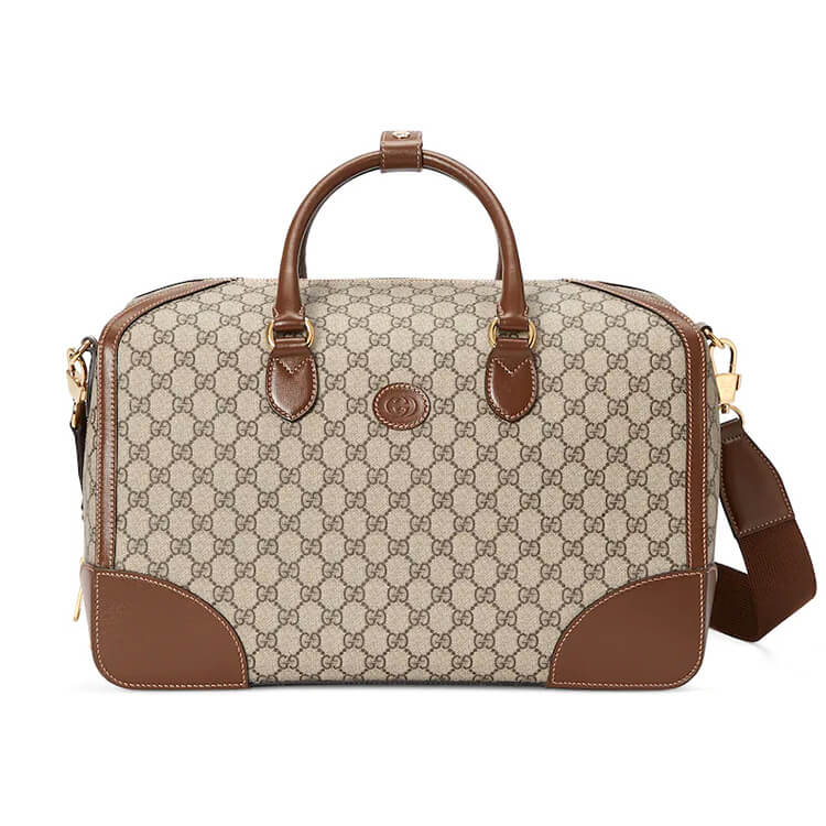 1:1 Mirror Quality Replica Gucci Duffle Bag With Interlocking G Style:696014 92THG 8563 Beige and ebony GG Supreme canvas Brown leather trim Cotton linen lining Oval Interlocking G leather tag Inside: 1 zip pocket Handle with 5.1″ drop Shoulder strap with 21.6″ drop Zip closure 16.5″W x 10.2″H x 9.4″D