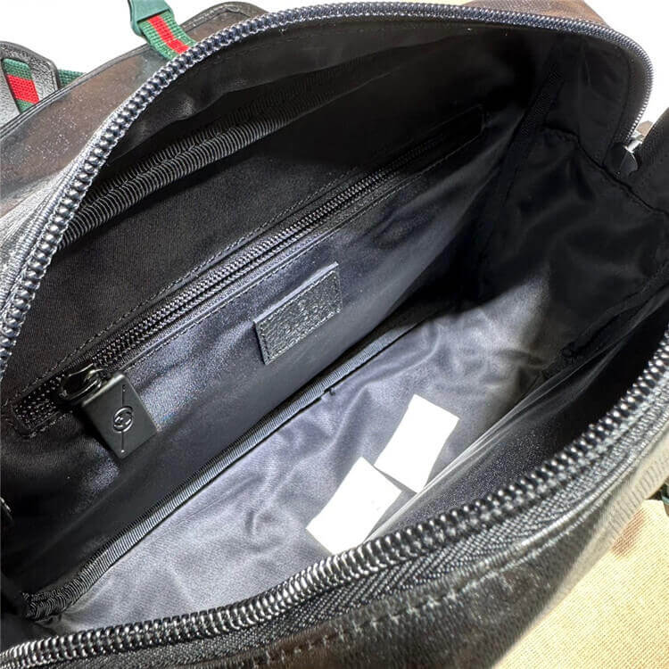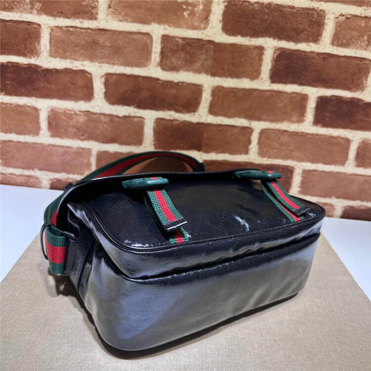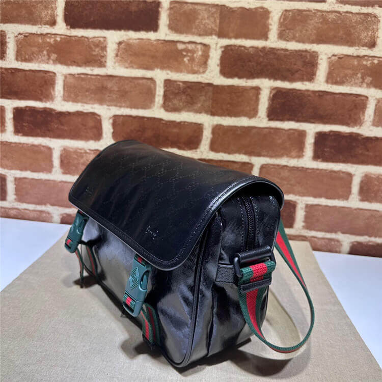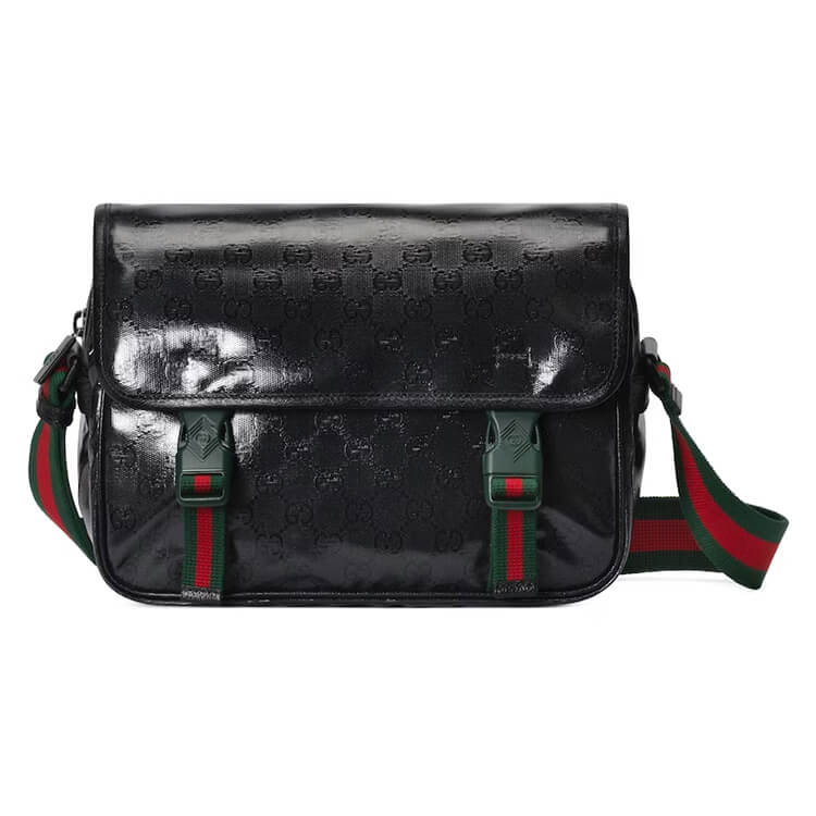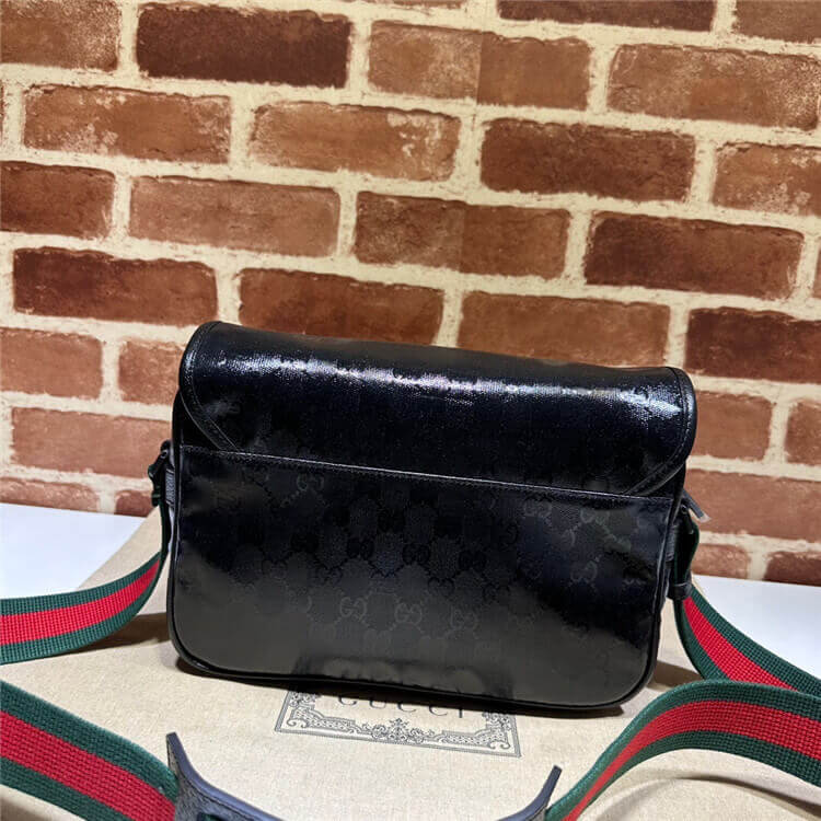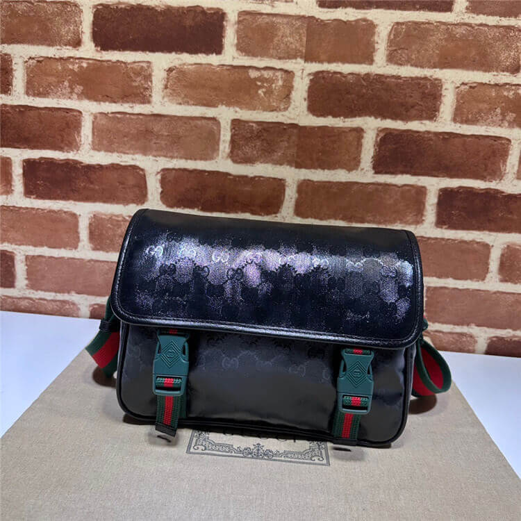 1:1 Mirror Quality Replica Gucci GG Crystal Messenger Bag Style:760123 FACLK 1094 Black GG Crystal canvas Black leather trim Green and red Web stripe Nylon lining 1 zip pocket under the flap Adjustable shoulder strap with 20.4″ drop Zip closure 10.6″W x 7.6″H x 4″D