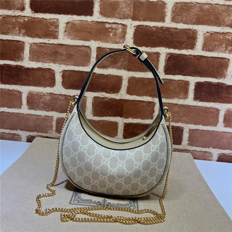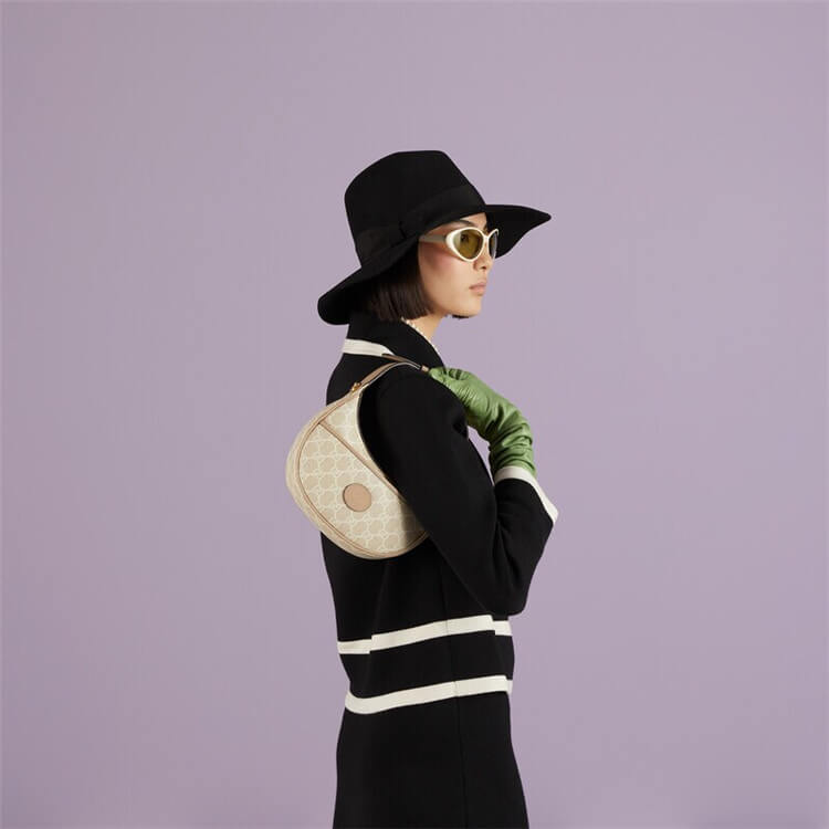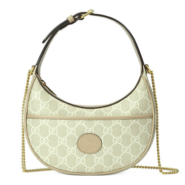 1:1 Mirror Quality Replica Gucci GG Half-moon-shaped Mini Bag Style:726843 FAA4G 9897 Beige and white GG Supreme canvas Oatmeal leather trim Cotton linen lining Oval Interlocking G leather tag Open front pocket Adjustable top handle with 6.7″ drop Chain shoulder with 23.6″ drop Zip closure 8.7″W x 4.9″H x 2″D