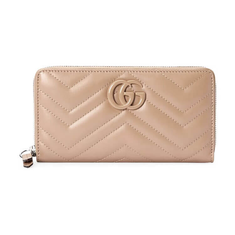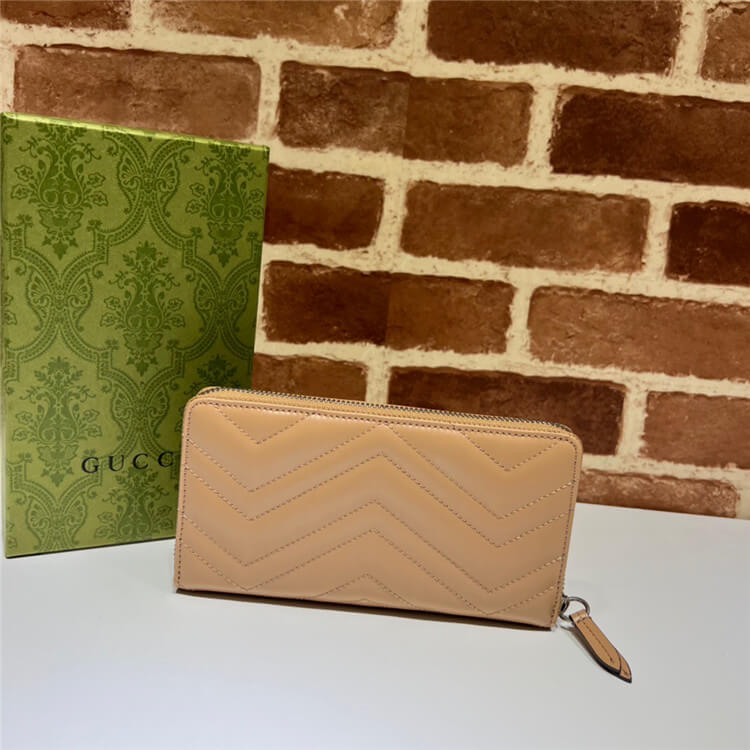 1:1 Mirror Quality Replica Gucci GG Marmont Matelasse Zip Around Wallet Style:443123 AABZK 2754 Rose beige matelasse chevron leather Brass hardware with rose beige ceramic effect finishing Moire lining Double G 12 card slots and three bill compartments Zip coin pocket Zip around closure 7.4″W x 4″H x .7″D