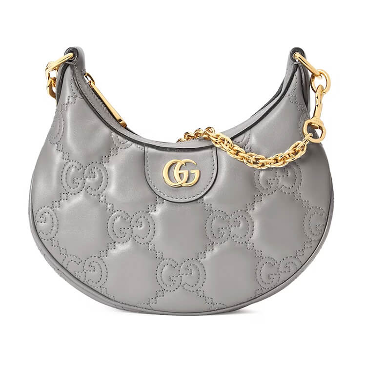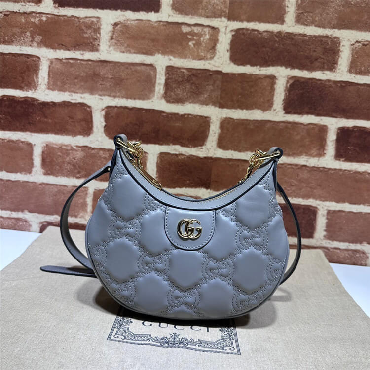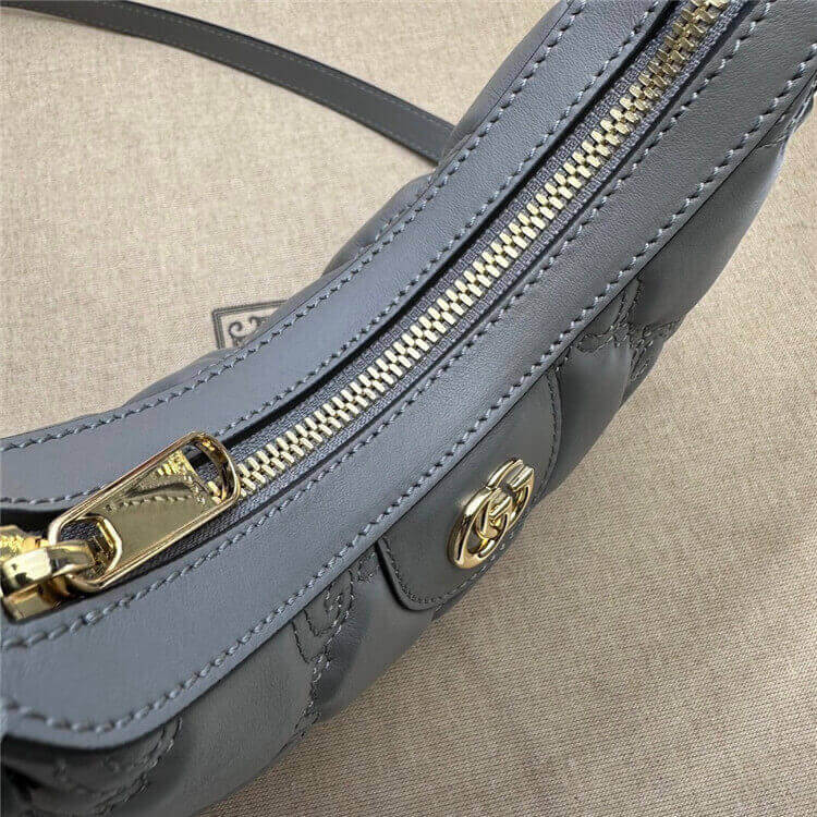 1:1 Mirror Quality Replica Gucci GG Matelasse Mini Bag Style:739736 UM8IG 1275 Grey GG Matelasse leather Gold-toned hardware Canvas lining Double G Inside: 1 open pocket Detachable chain top handle with 9.44″ drop Adjustable leather strap with 19.7″ drop Zip closure Mini size: 8.2″W x 5.5″H x 2.3″D