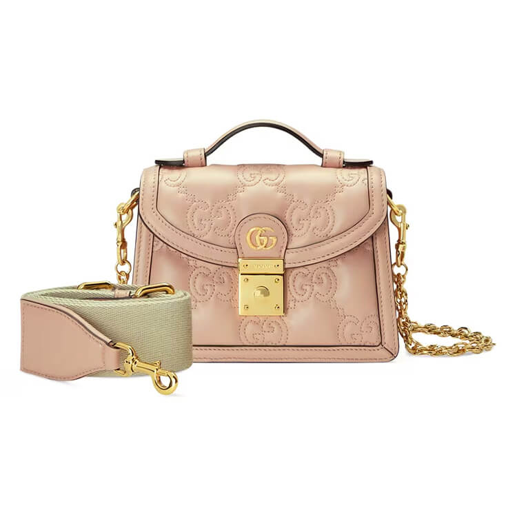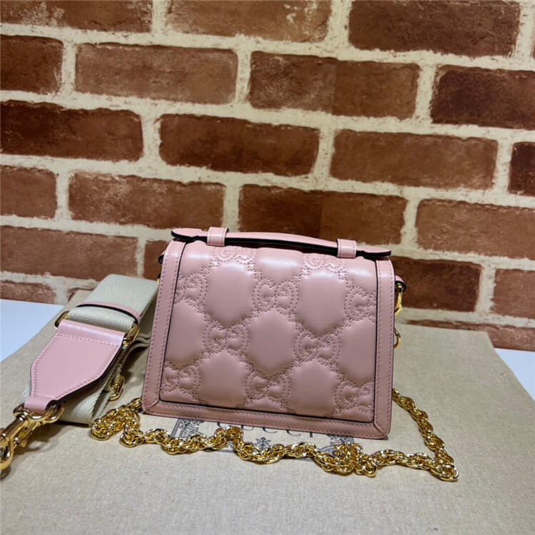 1:1 Mirror Quality Replica Gucci GG Matelasse Small Top Handle Bag Style:724499 UM8HG 5941 Pink GG matelasse leather Gold-toned hardware Double G This item comes with an additional canvas shoulder strap Top handle with 1″ drop Chain shoulder strap Clasp closure Small size: 7″W x 5.1″H x 2.5″D