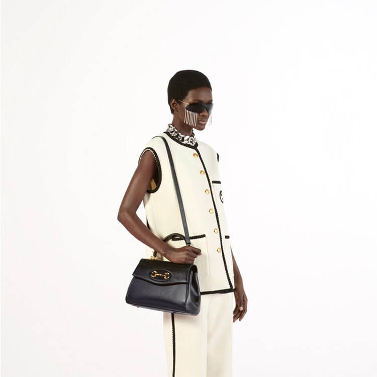 1:1 Mirror Quality Replica Gucci Horsebit 1955 Medium Bag Style:702049 AAA7G 1000 Black leather Shiny gold-toned hardware Horsebit Inside: 2 main compartments and 1 zip pocket 19.7″ chain strap and 21.6″ detachable leather strap Medium size: 11.4″W x 7.8″H x 5.1″D