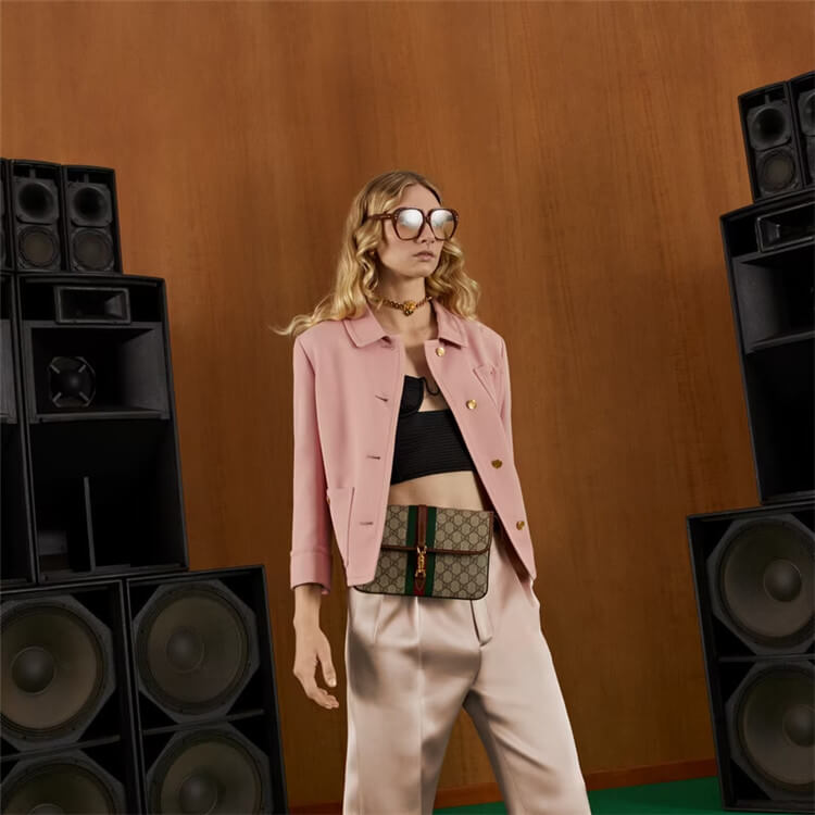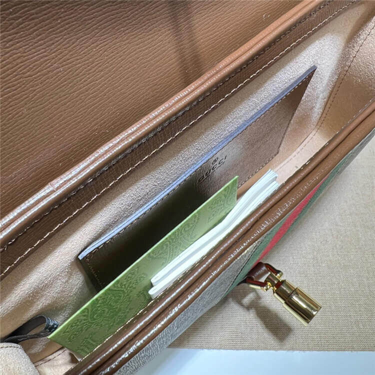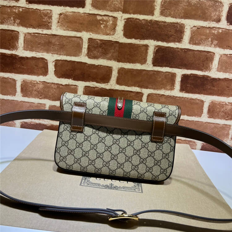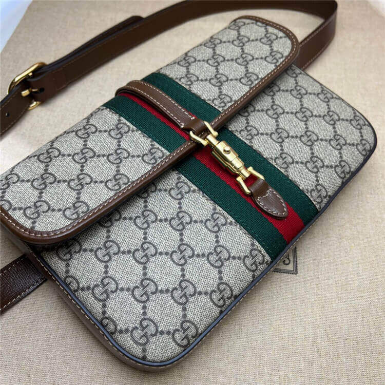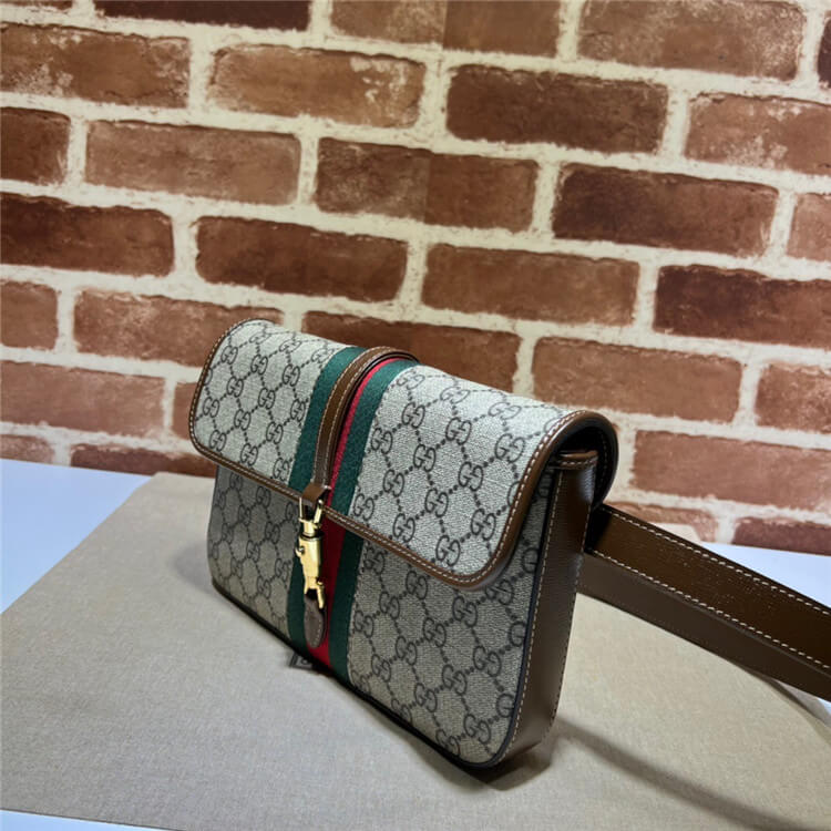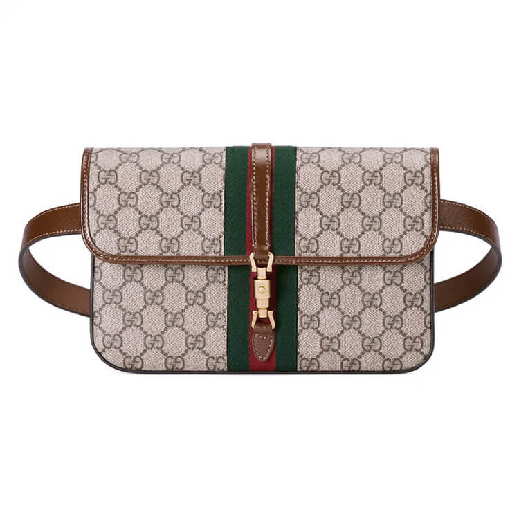 1:1 Mirror Quality Replica Gucci Jackie 1961 Belt Bag Style:699930 HUHHG 8565 Beige and ebony GG Supreme canvas Brown leather trim Gold-toned hardware Green and red Web Microfiber lining Inside: 1 leather open pocket Flap and piston closure 9″W x 6.3″H x 1.2″D Weight: .354kg approximately