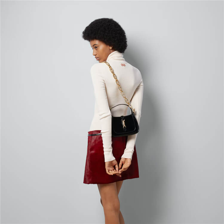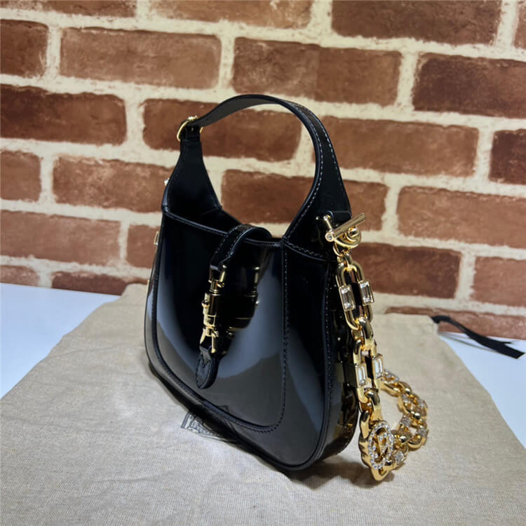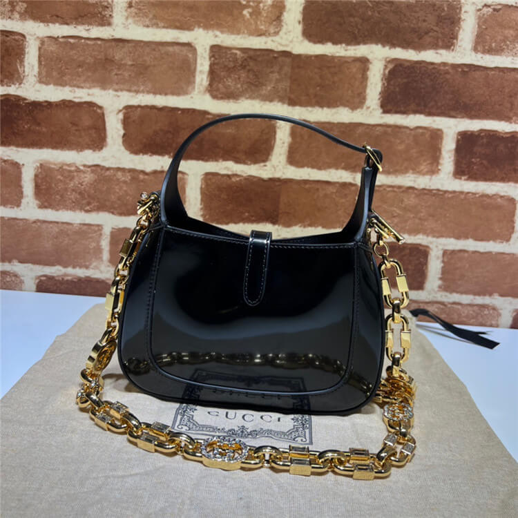 1:1 Mirror Quality Replica Gucci Jackie 1961 Mini Shoulder Bag Style:699651 1J7CG 1081 Black patent leather Gold-toned hardware Handle drop: 3.9″ Detachable chain shoulder strap with Interlocking G with crystals and 15.7″ drop Piston closure Mini size: 7.5″W x 5.1″H x 1.2″D